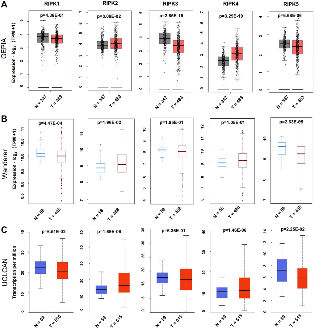 With a web server calculation, Gene Expression Profiling Interactive Analysis (GEPIA) database can illustrate us the gene expression difference and interactive relationship between cancer and normal tissue [38]. The Wanderer database can visualize gene expressions according to TCGA data [39]. UALCAN could offer researchers a group of comprehensive and interactive web data via analyzing cancer bio-information data [40]. We used these databases to estimate the expression level of RIPKs genes and also the roles of the RIPK family in clinic stage, prognosis as previous description [41]. P-values was set at 0.05 in our process.