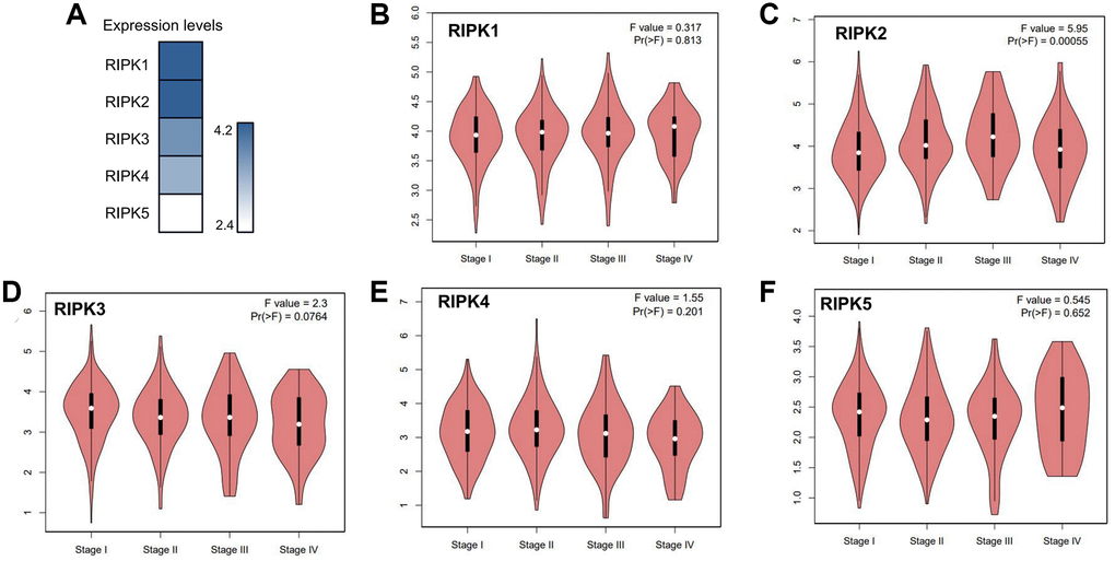 When evaluating the mRNA levels of the RIPK family in LUAD tissues, RIPK1 and RIPK2 turn out to be the top two expression gene, while RIPK5 expressed lowest (Figure 2A). Further, based on different pathological stages, the mRNAs levels of each RIPK members also analyzed respectively. Only RIPK2 expression positively correlated with pathological stage (p = 0.00055) (Figure 2C). No significant correlation observed in other RIPK family and pathological stages (p > 0.05, Figure 2B, 2D–2F). The data above implied that RIPK genes could participate in LUAD progression.