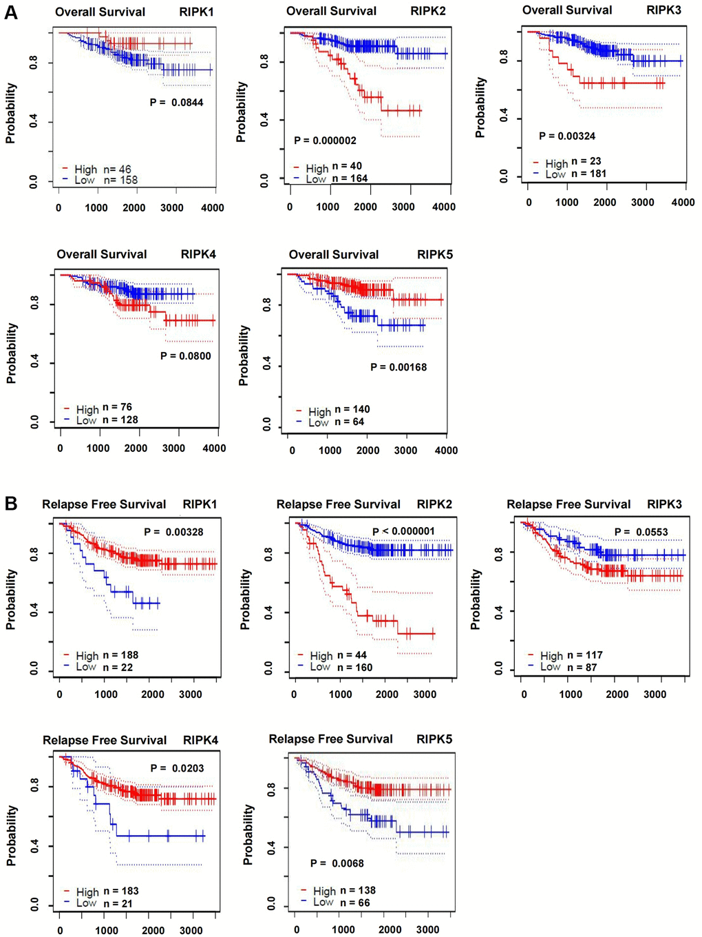 We use PrognoScan database [42] to analyze and illustrate the expression RIPK family members and the survival trend in LUAD patients. Here, overall survival (OS) and relapse-free survival (RFS) curves were included to evaluate the prognosis of patients with LUAD. P-value will offer if less than 0.05.