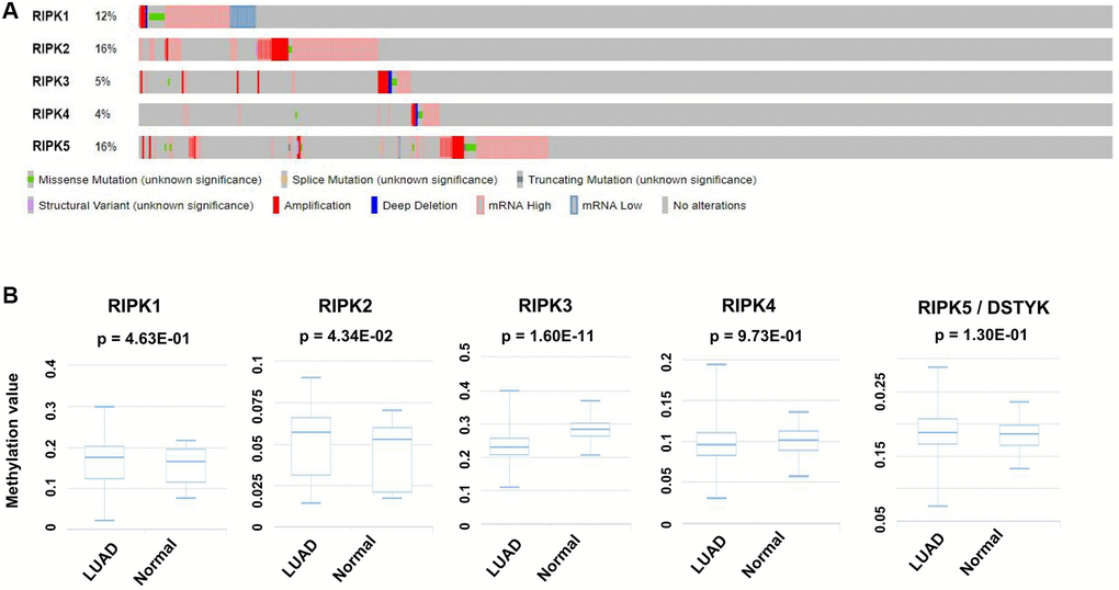 Genetic alteration and methylation level of the RIPK family in LUAD patients