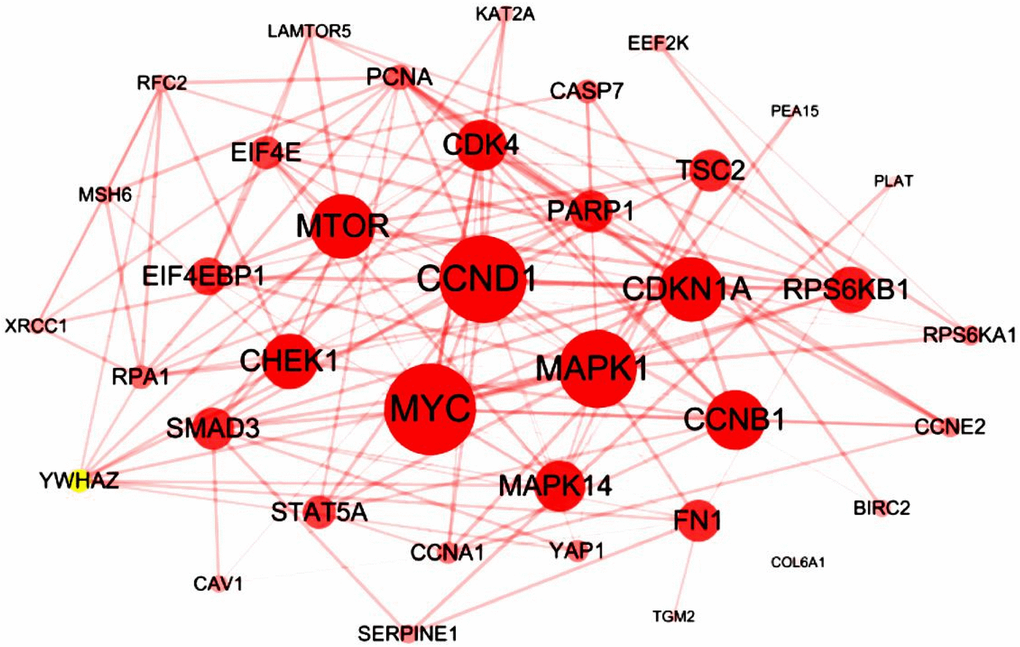 We analyzed cBioPortal database and finally extracted 42 most frequently altered genes which mRNA levels were significantly correlated to the RIPK members in LUAD patients. Several hub genes, including CCND1, MYC, MTOR, MAPK1, CDKN1A and CCNB1, were turned out to participate actively in the bio-malignant behaviors of RIPK family modulation in LUAD cases (Figure 5).