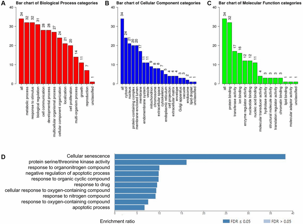 Next, WebGestalt database was applied to estimate the biological functions of RIPK family based on the strong relevant genes above. As shown in the GO pathways, the top enriched biological processes were metabolic process, response to stimulus, biological regulation and cell communication (Figure 6A). Cellular component categories were highly enriched in cytosol, nucleus protein-containing complex, membrane-enclosed lumen, membrane (Figure 6B). When involving the molecular function categories, the top five related function were protein binding, transferase activity and ion binding (Figure 6C).