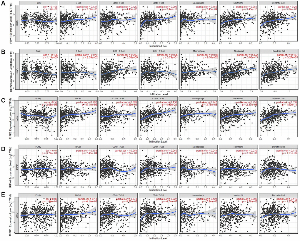Recent study illustrated that the roles of immune cells should be seriously considered in the LAUD progression, as well as their impacts on treatment efficiencies and prognosis. Hence, we identified the connection between RIPK family members and six distinct immune subsets which infiltrated tumor via TIMER database analysis. Intriguingly, RIPK1 was positively linked to the infiltrated B cell (Cor = 0.137, p = 2.50e-03), CD8+ T cell (Cor = 0.129, p = 4.43e-03), CD4+ T cell (Cor = 0.295, p=3.44e-11), macrophage (Cor = 0.166, p=2.45e-04), neutrophil (Cor = 0.281, p = 3.45e-10), dendritic cell (Cor = 0.26, p = 5.84e-09) (Figure 7A). RIPK2 level was positively related to the infiltrated CD8+ T cell (Cor = 0.263, p = 3.58e-09), neutrophil (Cor = 0.322, p = 3.90e-13), dendritic cell (Cor = 0.187, p = 3.27e-05) (Figure 7B). Further, positive correlation was spotted between RIPK3 and B cell (Cor = 0.262, p = 5.14e-09), CD4+ T cell (Cor = 0.438, p = 4.09e-24), macrophage (Cor = 0.247, p = 3.75e-08), neutrophil (Cor = 0.251, p = 2.37e-08), dendritic cell (Cor = 0.339, p = 1.50e-14) (Figure 7C). For RIPK4, we found its mRNA level positively related to infiltrated B cell (Cor = 0.153, p = 7.40e-04), CD4+ T cell (Cor = 0.265, p = 3.189e-09), dendritic cell (Cor = 0.113, p = 1.21e-02) (Figure 7D). Finally, expression of RIPK5(DSTYK) showed its positive relationship to B cell (Cor = 0.13, p = 4.14e-03), CD4+ T cell (Cor = 0.227, p = 4.74e-07), macrophage (Cor = 0.121, p = 7.84e-03), neutrophil (Cor = 0.095, p = 3.78e-02), dendritic cell (Cor = 0.1126, p = 1.37e-02) (Figure 7E).