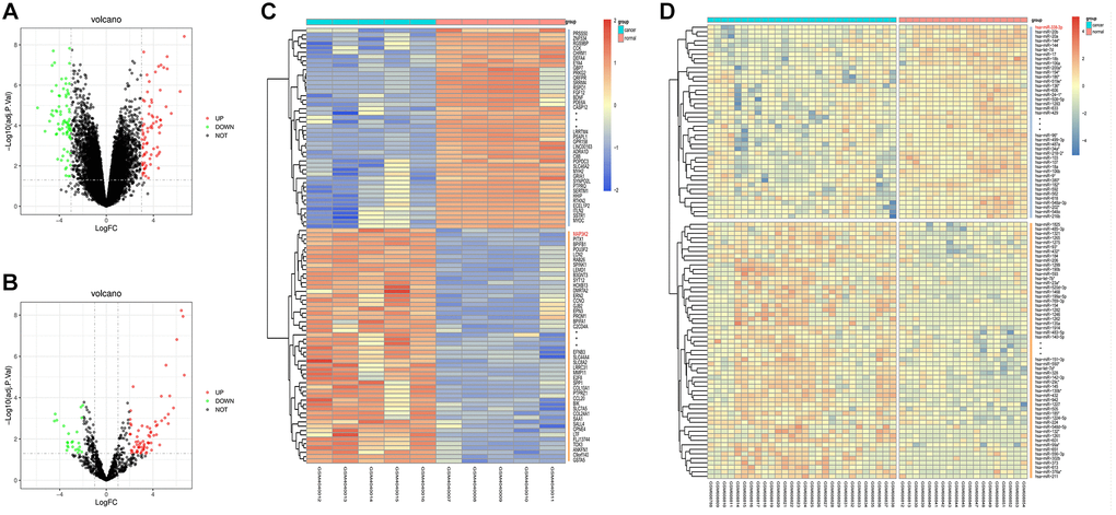 Firstly, the LUAD-related gene expression dataset GSE136043 and the miRNA sequencing dataset GSE24709 containing data of LUAD patients were downloaded from Gene Expression Omnibus (GEO) database (https://www.ncbi.nlm.nih.gov/gds/). Then the quantile normalization was performed on RNA-seq data and differentially expressed genes (DEGs) (|logFC|>1, P < 0.05) using limma (R/Bioconductor software package). Later, a volcano plot was constructed to visualize the DEGs in GSE136043 using R with ggplot2 package, and a cluster analysis heatmap of DEGs was plotted in R with pheatmap package. In the same way, DEGs in GSE24709 were visualized by the volcano plot, and the cluster analysis was conducted using the heatmap.