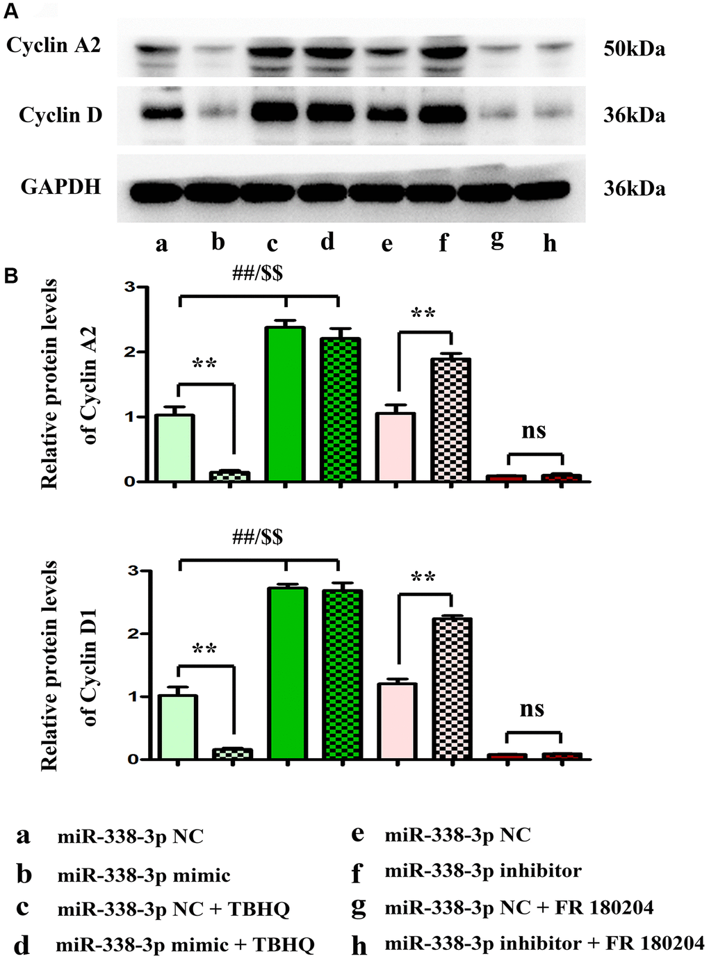 Overexpression of miR-338-3p inhibited the proliferation of LUAD cells by suppressing cyclin A2 and cyclin D1