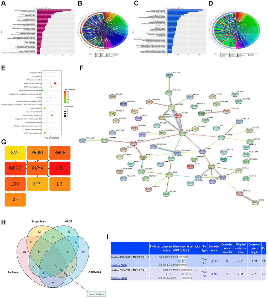 The diagrams of up-regulated (Figure 2A, 2B) and down-regulated (Figure 2C, 2D) GO pathways of DEGs were plotted by R programming. The GO pathway diagrams illustrated that both up-regulated pathways (positive regulation of MAPK activity, regulation of angiogenesis, and positive regulation of cell migration) and down-regulated pathways (oxidation-subtraction process, positive regulation of gene expression, and silicon morphogenesis) were enrichment pathways for LUAD. Moreover, the KEGG pathway diagram of DEGs (Figure 2E) revealed that the MAPK signaling pathway, ECM-sensor interaction and other signaling pathways were enriched. PPI analysis for DEGs in GO pathway was carried out by string online tool and Cytoscape software (Figure 2F). In the PPI network established based on string database, the most significant modules were selected using the MCODE plug-in in Cytoscape. For the most significant module, the cytoHubba plug-in was used to calculate the top 10 key genes with the degree algorithm, including MAP3K2 (Figure 2G).