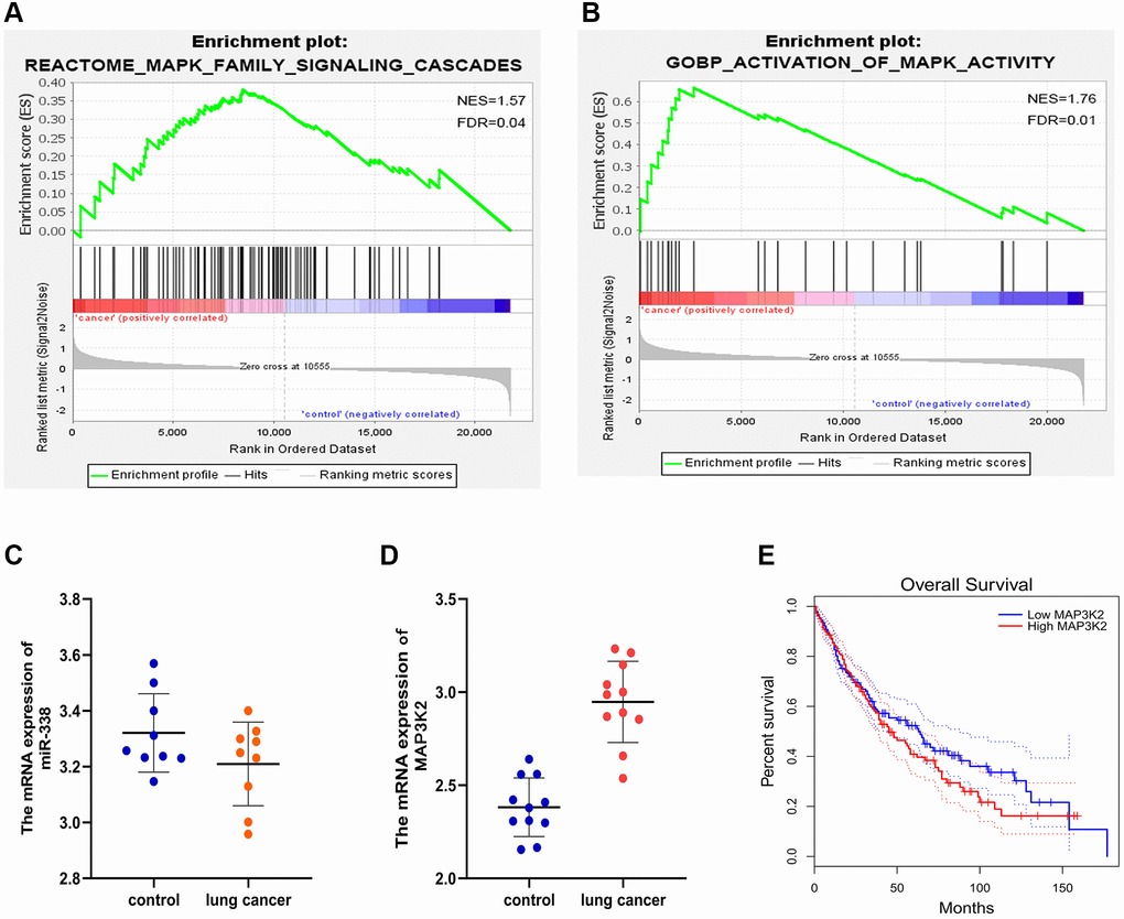 The analysis of LUAD-related genes from GEO and TCGA databases showed that miR-338-3p was lowly expressed (Figure 3C), and MAP3K2 was highly expressed (Figure 3D) in LUAD tissues. Besides, it was also discovered that the highly-expressed MAP3K2 displayed a relevance to a low survival rate (Figure 3E).