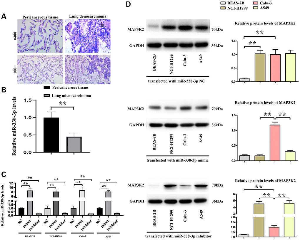 The human specimens of lung adenocarcinoma and its pericancerous tissue were identified by HE staining and shown in Figure 4A, the relative expression levels of miR-338-3p were tested by Q-PCR and our results showed the significantly decreased miR-338-3p were found in lung adenocarcinoma tissue vs pericancerous tissue, shown in Figure 4B, and then the normal human BEAS-2B cells are epithelial cells, isolated from pathological sections of normal human bronchial epithelium, and human adenocarcinoma cell lines, included the NCI-H299, Calu-3, A549 cells were transfected with miR-338-3p mimic and inhibitor. The relative miR-338-3p levels were tested by Q-PCR and results were showed in Figure 4C, indicating the transfection efficiency was effective. Then the protein levels of MAP3K2 were tested by western blot, the results showed the MAP3K2 proteins were negatively related the expression of miR-338-3p in NCI-H299, A549 cells but not in BEAS-2B and Calu-3 cells, and the results were shown in Figure 4D.