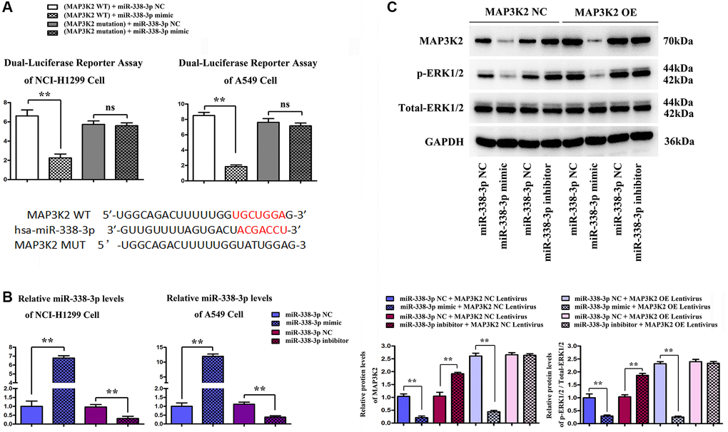 The effect of miR-338-3p on MAP3K2 transcription was investigated by luciferase reporter assay in HCI-H1299 and A549 cells, as well as the putative wild-type MAP3K2 3′-UTR binding sequence as well as the mutation sequence were shown in Figure 5A. The miR-338-3p mimic, inhibitor and negative controls (NC) were transfected into HCI-H1299 and A549 cells and selective miR-338-3p expression levels are shown in Figure 5B. After transfection of A549 cells with miR-inhibitor, MAP3K2 protein level was significantly increased, while p-ERK1/2 was also increased. However, after exogenous overexpression of miR-338-3p, the protein expressions of MAP3K2 and p-ERK1/2 were significantly reversed. Moreover, it was found that after under miR-338-3p inhibited state, the protein expressions of MAP3K2 and p-ERK1/2 among groups were also elevated (Figure 5C).
