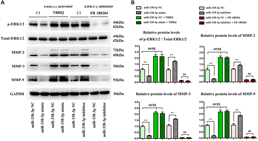 Meanwhile, ERK1/2 agonist TBHQ and ERK1/2 inhibitor FR180204 [12] were added to further verify that miR-338-3p affected the expression of proteins related to the migration and invasion function of A549 cancer cells through the ERK pathway. As shown in Western blotting assay, the protein expressions of MMP-2, MMP-3 and MMP-9 in LUAD cells significantly declined after exogenous overexpression of miR-338-3p. Compared with those in NC inhibitor group, the expression levels of proteins related to migration and invasion function of A549 cells in miR-inhibitor group were obviously increased. After the addition of TBHQ, the protein expressions of p-ERK1/2, t-ERK1/2, MMP-2, MMP-3 and MMP-9 in miR-mimic group had no significant changes compared with those in NC mimic group. After the addition of FR180204, there were no significant changes in the expressions of these proteins in miR-inhibitor group compared with those in NC inhibitor group. These findings suggested that miR-338-3p affects the migration and invasion of LUAD cells through the ERK pathway (Figure 7A, 7B).