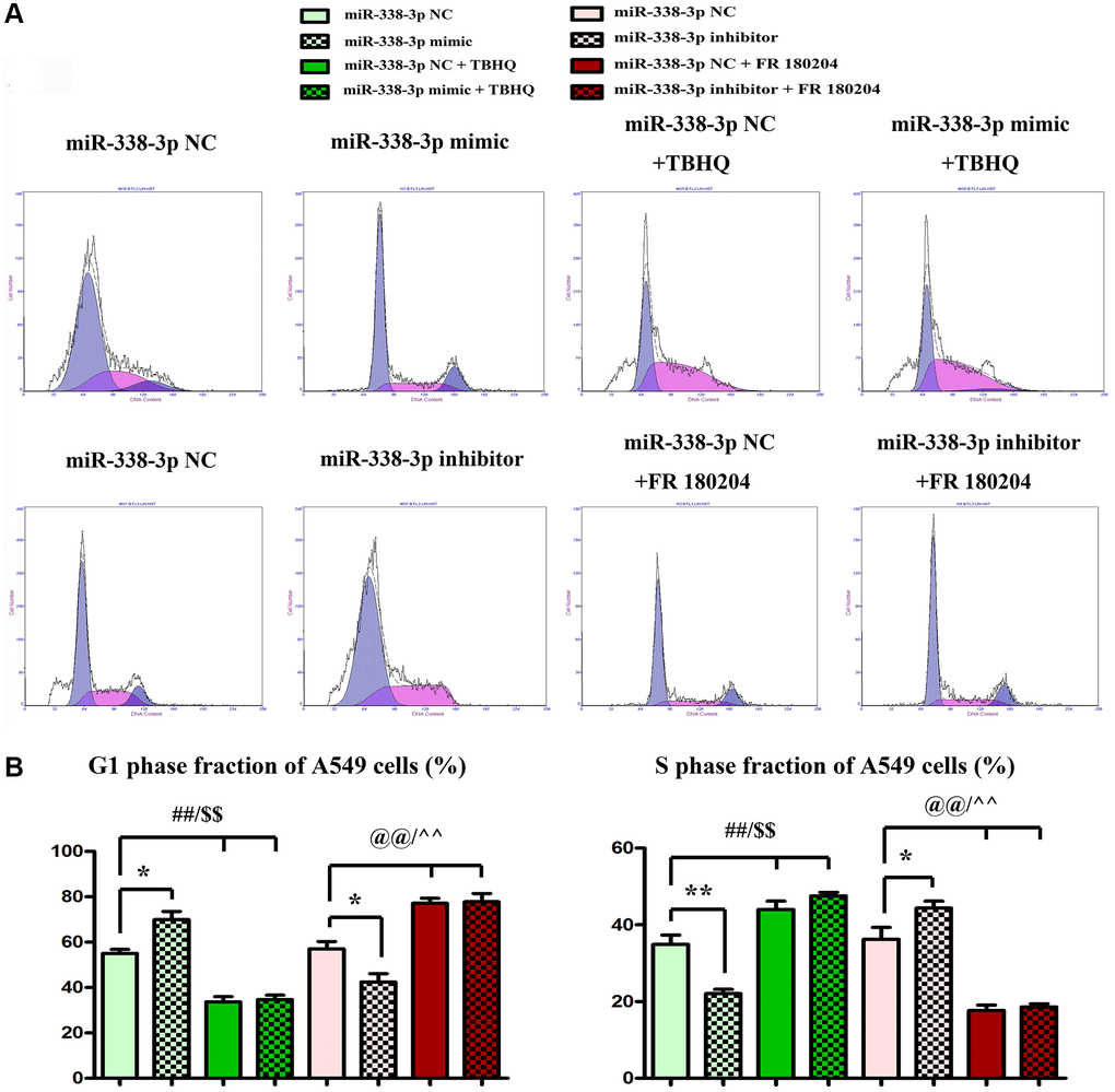 The proliferation ability of LUAD cells was detected by colony formation assay. Compared with NC mimic group, the number of colonies formed by NCI-H1299 cells as well as A549 cells which were cloned in miR-mimic group declined remarkably, suggesting that miR-338-3p overexpression can inhibit the proliferation of tumor cells. However, the miR-inhibitor group had more colonies formed by LUAD cells which were cloned than NC inhibitor group, these results were shown in Figure 8A, 8B. At the same time, the cell cycle was analyzed by flow cytometry. Compared with NC groups, the percentage of cells arrested in G1 phage was increased, while the ratio of cells in S phage was decreased in the miR-mimic group, but they were contrary in miR-inhibitor group, and their roles were reversed by ERK1/2 activator or inhibitor (Figure 9A, 9B). Furthermore, Western blotting assay was conducted to detect the expression of cell proliferation-related proteins, and the results suggested that compared with those in NC mimic group, the protein expression levels of cyclin A2 and cyclin D1 in A549 cells in miR-mimic group were dramatically reduced, but they were raised remarkably after A549 cells were transfected with miR-inhibitor. The effects of miR-338-3p were rectified by ERK1/2 activator TBHQ, and the roles of miR-338-3p inhibitor were reversed by ERK1/2 inhibitor FR180204 (Figure 10A, 10B). These results indicated that the modulatory roles of miR-338-3p were dependent on the activation of ERK1/2.