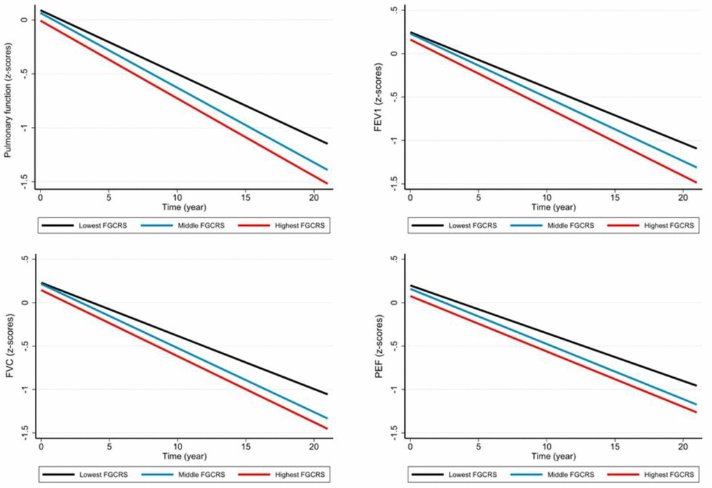 During a median follow-up of 7 years, when FGCRS was treated as a continuous variable, higher FGCRS was associated with a faster decline in PF (β: -0.002, 95% CI: -0.003 to -0.000) and a faster decline in FVC (β: -0.001, 95% CI: -0.002 to -0.000) and FEV1 (β: -0.001, 95% CI: -0.002 to -0.000) over time.