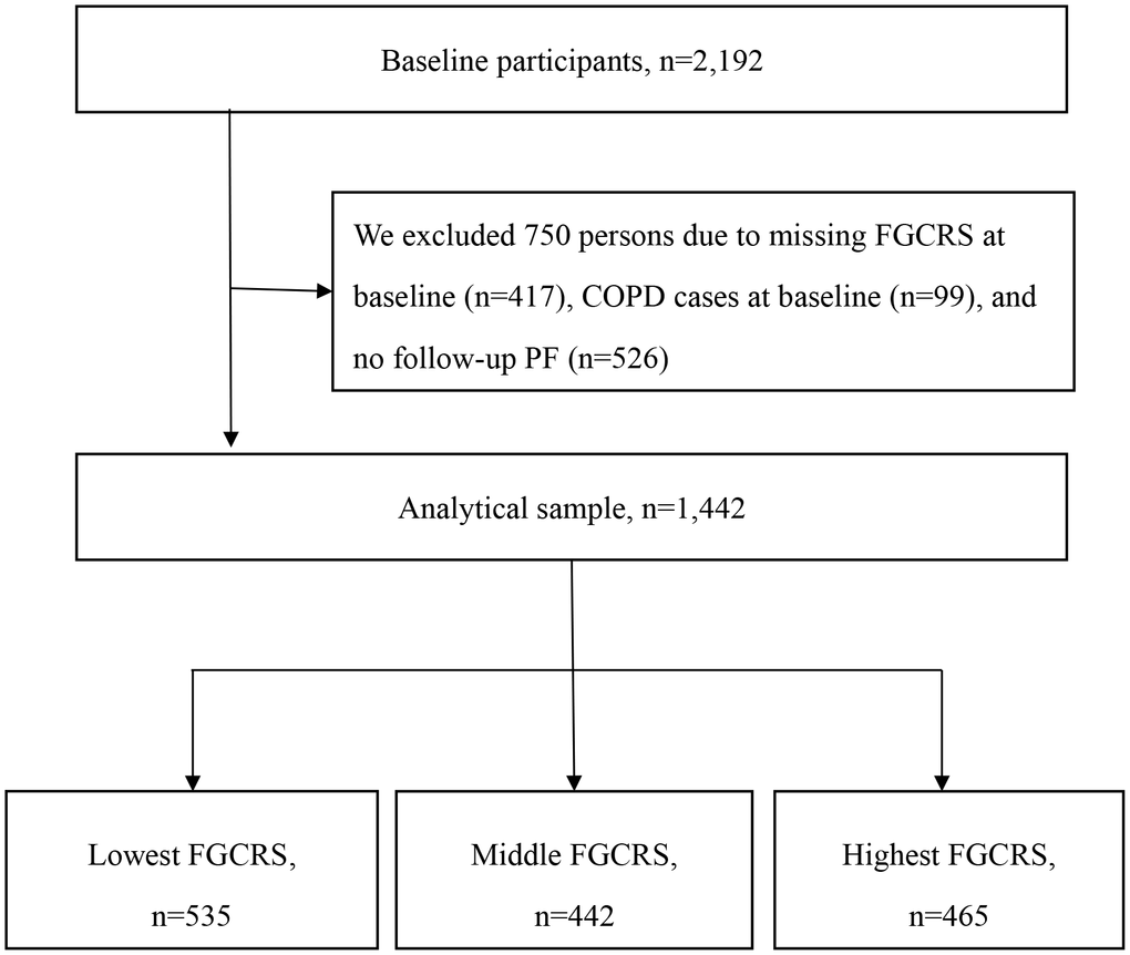 From 1997, 2,192 participants were enrolled and annually followed for up to 22 years till 2020 [17]. Among them, 750 participants with missing baseline FGCRS (n=417), chronic obstructive pulmonary disease (COPD) cases (n=99), or lacking follow-up PF information (n=526) were excluded, and 1,442 individuals were enrolled in the current analysis (Figure 2).