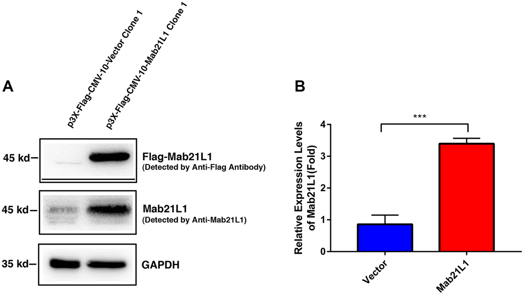 To explore the function of Mab21L1, we have overexpressed the human Mab21L1 cDNA in mouse lens epithelial cells αTN4-1 using the vector p3X-FLAG-CMV-10-Mab21L1 [with cDNA inserted in EcoRI (5’) and Kpn I (3’)] (Supplementary Figure 1). As shown in Figure 1A, 1B, αTN4-1 cells have very low level of endogenous Mab21L1, and overexpression of human Mab21L1 lead to over 2-fold upregulation of Mab21L1. Thus, we established two stable lines: vector-transfected cells, p3X-FLAG-CMV-10-αTN4-1 (Vector-αTN4-1 in short), and Mab21L1-transfected cells, p3X-FLAG-CMV-10-Mab21L1-αTN4-1 (Mab21L1-αTN4-1 in short). The clone 1 from both vector- and Mab21L1-transfected cells were used in most related experimental studies described below.