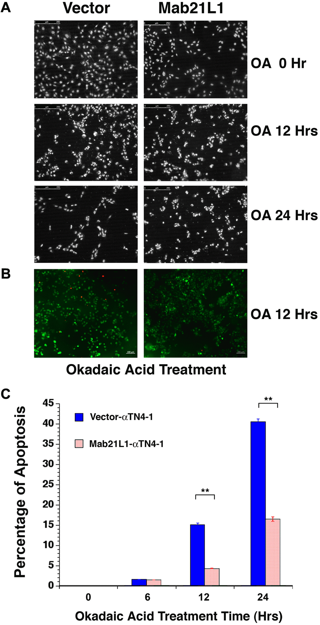 Next, we tested if Mab21L1 expression cells display any property in resisting stresses upon exposure to phosphatase inhibitor, okadaic acid [38]. Both vector- and Mab21L1-transfected cells were treated with 100 nM okadaic acid for 0 to 24 hours. As shown in Figure 2, cells expressing Mab21L1 were much resistant against 100 nM okadaic acid than vector-transfected cells. After 24-hour treatment by 100 nM OA, over 40% vector-transfected cells underwent apoptosis. In contrast, less than 20% cells were induced to undergo apoptosis (Figure 2A, 2C). The apoptotic nature was confirmed with live/dead assay in which the live cells were stained in green color and the dead cells were stained in red (Figure 2B). Thus, Mab21L1 can promote survival of the transfected lens epithelial cells. Mab21L1 also displayed clear protection against UVA irradiation-induced apoptosis (data not shown).