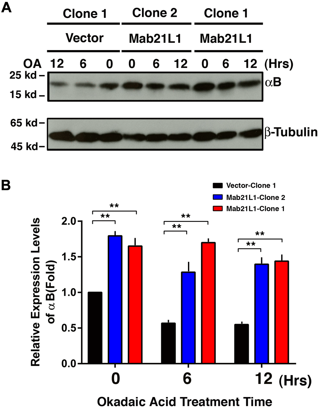 To explore how Mab21L1 could promote survival of lens epithelial cells against stress conditions including the okadaic acid and UVA irradiation, we examined expression of αB-crystallin during treatment by okadaic acid. As shown in Figure 3, cells expressing Mab21L1 displayed enhanced expression of αB-crystallin. Moreover, during okadaic acid treatment, in Mab21L1 expression cells, OA-induced downregulation of αB-crystallin was much slower than that in vector-transfected cells. Thus, Mab21L1 expression upregulates αB-crystallin, a small heat shock protein having strong antiapoptotic ability [38, 51, 54, 82–89].