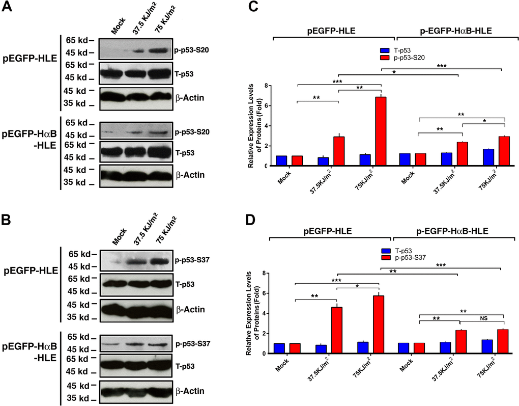 We and others have previously shown that αB-crystallin can prevent apoptosis through regulation of multiple targets [38, 51, 54, 82–86]. To further explore the possible mechanisms how αB-crystallin prevents apoptosis, we examined the effects of αB-crystallin on p53 phosphorylation at S-20 and S-37. As shown in Figure 4, in vector-transfected cells (pEGFP-HLE), UVA irradiation induces significant hyperphosphorylation of p53 at S-20 and S-37. However, in αB-crystallin expression cells (pEGFP-HαB-HLE), UVA irradiation-induced hyperphosphorylation of p53 was much reduced. Thus, αB-crystallin can prevent UVA-induced hyperphosphorylation of p53 at S-20 and S-37.