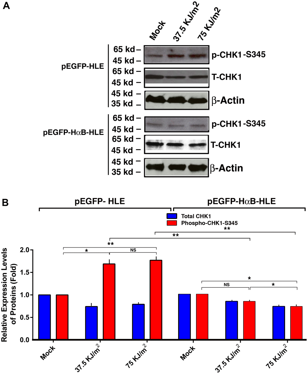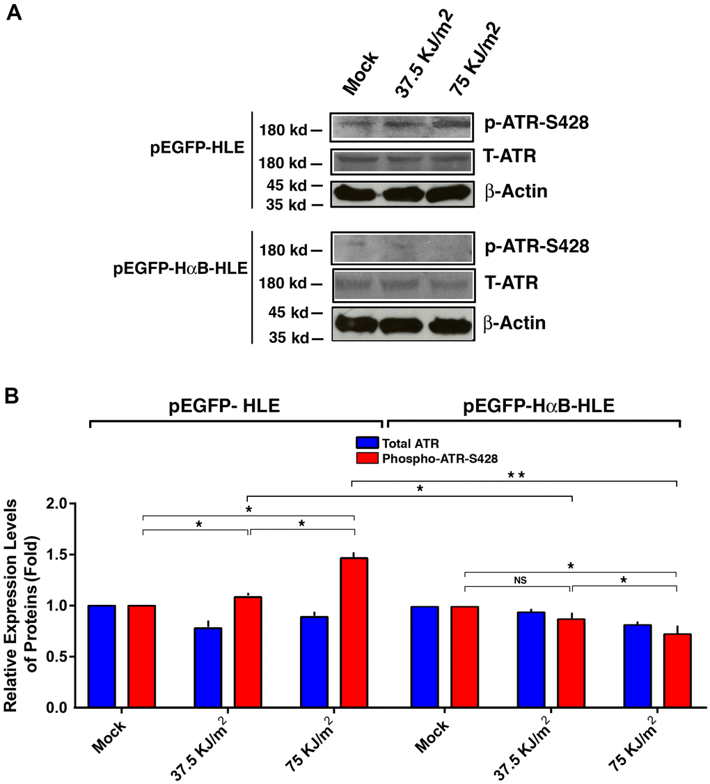 It has been well established that p53 can be phosphorylated by check kinase 1 (CHK1) at S-20 and S-37 [93, 94]. Our results also showed that while in vector-transfected cells (pEGFP-HLE), UVA irradiation increased CHK1 activity, in αB-crystallin expression cells (pEGFP-HαB-HLE), however, both CHK1 protein level and activity were down-regulated under UVA irradiation (Figure 5). Since CHK1 is activated by ATR kinase [95–98], we also examined the differential activation of ATR in vector- and HαB-transfected cells. Our results demonstrated that while in vector-transfected cells, pEGFP-HLE, UVA induced upregulation of ATR activity from 20% to 50% under irradiation with 37.5KJ/m2 to 75 KJ/m2, respectively; in αB-crystallin expression pEGFP-HαB-HLE cells, in contrast, both ATR protein level and activity were slightly down-regulated under UVA irradiation of both doses (Figure 6). Together, out results demonstrate that αB-crystallin can repress ATR/CHK1/p53 pathway to inhibit p53-mediated apoptosis.