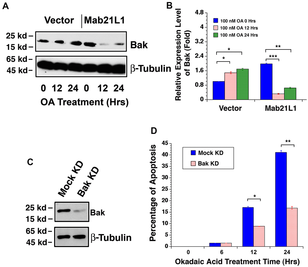Mab21L1 downregulates Bak during OA-induced apoptosis and silence of Bak attenuates OA-induced apoptosis