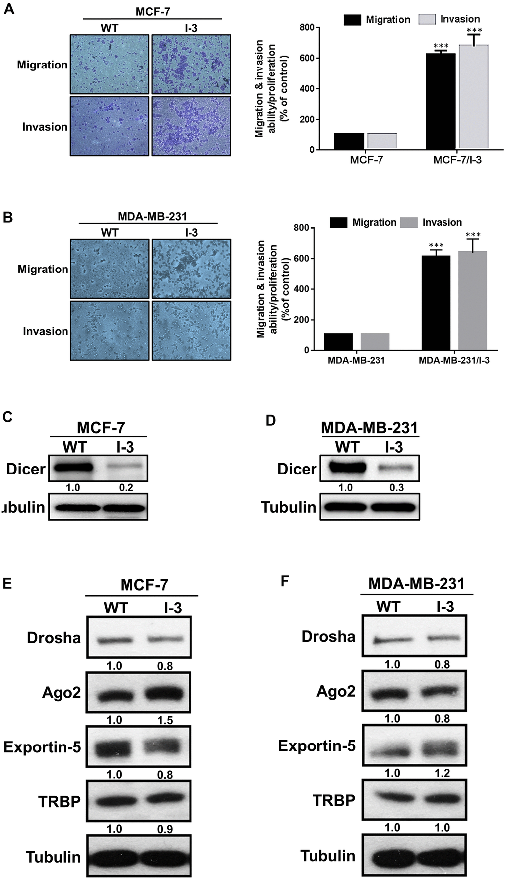 Next, we examined the expression levels of miRNA biogenesis-related proteins in the parental and highly invasive cells and observed that Dicer expression was lower in the highly invasive cells (Figure 1C, 1D). Moreover, we examined the expression levels of other miRNA biogenesis–related proteins, namely Drosha, Ago2, exportin-5, and TAR-RNA binding protein (TRBP), in the highly invasive and parental cells. The expression levels of these miRNA machinery proteins did not significantly differ between the highly invasive and parental cells. (Figure 1E, 1F). The aforementioned results indicate that Dicer plays a crucial role in the migration, invasion, and metastasis of breast cancer.
