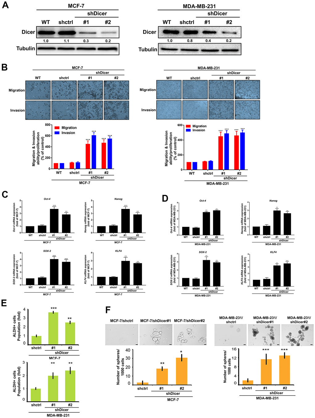 We noted significantly lower Dicer expression in the highly invasive cells. Moreover, some studies have reported that Dicer plays an important role in regulating tumor progression in different types of cancer [8, 23]. Thus, in the present study, to investigate whether Dicer affects the migration, invasion, and CSCs properties of breast cancer cells, we established stable Dicer-silenced (MCF-7/shDicer and MDA-MB-231/shDicer) cells, respectively (Figure 3A). Moreover, we further evaluated the effects of Dicer on the cell migratory/invasive abilities and found that Dicer silencing enhanced both cell migration and invasion (Figure 3B). In addition, cancer stemness is a primary driver of cancer recurrence and metastasis [24–26]. Therefore, we surmised that Dicer participates in regulating the CSCs properties of breast cancer cells. The results of reverse transcription-quantitative polymerase chain reaction (qRT-PCR) demonstrated that the knockdown of Dicer significantly increased the expression of the stemness-related transcriptional factor markers Oct-4, Nanog, SOX-2, and KLF4 (Figure 3C, 3D). Consistently, the results of the aldehyde dehydrogenase 1 (ALDH1) activity assay revealed that ALDH1 activity was higher in the shDicer cells than in the knockdown control (shCtrl) cells (Figure 3E). Furthermore, we examined the self-renewal ability of CSCs and observed that Dicer knockdown increased the diameter and quantity of mammospheres (Figure 3F). These data indicate that the knockdown of Dicer expression can promote the cell migratory/invasive abilities and enhanced CSCs properties in breast cancer cells.