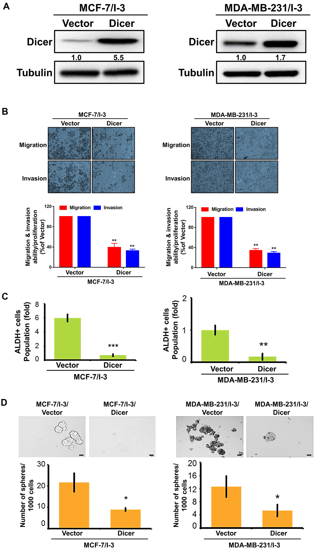 To investigate whether Dicer affects the cell migratory/invasive abilities and CSCs properties of the breast cancer, we transfected Dicer-overexpressing plasmids into the highly invasive cells and determined the overexpression efficiency of Dicer through a Western blot analysis (Figure 4A). The overexpression of Dicer enhances the cell migratory/invasive abilities of the highly invasive breast cancer cells, whereas silencing of Dicer markedly reduced the cell migratory/invasive abilities of breast cancer (Figure 4B). Moreover, Dicer overexpression significantly reduced ALDH activity (Figure 4C). We determined the self-renewal ability of the breast cancer cells through the sphere formation assay, and the results revealed that the overexpression of Dicer inhibited sphere formation (Figure 4D). These results indicated that the overexpression of Dicer suppresses the migration, invasion, and CSCs properties of breast cancer cells.