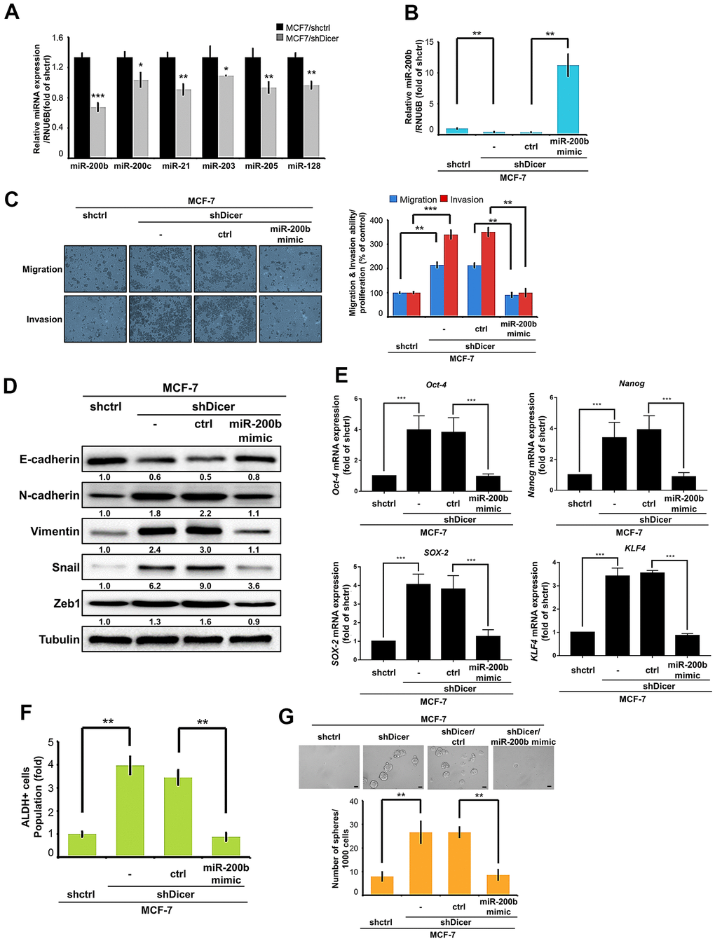 Dicer is a major enzyme in the miRNA biogenesis machinery and is crucial for miRNA processing and maturation. Accumulating evidence demonstrates that several miRNAs (miR-200b, miR-200c, miR-21, miR-203, miR-205, and miR-128) may be correlated with the epithelial mesenchymal transition (EMT) and CSCs properties in breast cancer cells [27]. Thus, we focused on these relevant miRNAs and determined whether their expression affects the EMT and cancer stemness of the cancer cells. The results of real-time RT-PCR revealed that the levels of these candidate miRNAs decreased in the MCF-7/shDicer cells. Among them, miR-200b appeared as the most significant difference in MCF-7/shDicer cells and MCF-7/shCtrl cells (Figure 5A). By contrast, the overexpression of Dicer in the MCF-7/I-3 cells significantly increased miR-200b expression (Supplementary Figure 1A). Moreover, we also found that miR-200b was downregulated in the highly invasive breast cancer cells (MCF-7/I-3 and MDA-MB-231/I3) compared with the parental cells (Supplementary Figure 1B). Increasing evidence has implicated that miR-200b may participate in tumor progression and stemness regulation [28, 29]. Thus, we hypothesized that Dicer enhances the cell migratory/invasive abilities, and CSCs properties of breast cancer cells through miR-200b. To confirm this hypothesis, we transfected a miR-200b mimic into the MCF-7/shDicer cells and confirmed its transfection efficiency through RT-qPCR (Figure 5B). Next, we investigated whether the overexpression of miR-200b abolished Dicer knockdown induced cell migratory/invasive abilities. Our results showed that transfecting a miR-200b mimic into the MCF-7/shDicer cells successfully inhibited Dicer knockdown induced cell migratory/invasive abilities (Figure 5C). Consistently, the inhibition of miR-200b expression resulted in the recovery of the cell migratory/invasive abilities in MCF-7/I-3/Dicer cells (Supplementary Figure 1C). In addition, we investigated whether miR-200b affects the expression of EMT markers in the MCF-7/shDicer cells and observed that the transfection with a miR-200b mimic into the MCF-7/shDicer cells reduced N-cadherin, Vimentin, snail, and Zeb-1 expression levels and increased E-cadherin expression level (Figure 5D). Moreover, we also examined whether Dicer inhibition promoted cancer stemness properties through miR-200b. We performed qRT-PCR to analyzed the expression of cancer stemness markers and found that the overexpression of miR-200b in the MCF-7/shDicer cells reduced the expression of the stemness markers Oct-4, Nanog, SOX-2, and KLF4 (Figure 5E). Consistent with the aforementioned findings, the inhibition of miR-200b restored the expression of the cancer stemness markers suppressed by the overexpression of Dicer (Supplementary Figure 1D). Furthermore, we examined whether Dicer inhibition promotes cancer stemness properties through miR-200b by performing ALDH activity assay. The overexpression of miR-200b significantly decreased ALDH activity in the MCF-7/shDicer cells (Figure 5F). Notably, we further evaluated the self-renewal ability of the CSCs by performing a sphere formation assay; the results revealed that the inhibition of Dicer expression increased sphere diameter and quantity. By contrast, the overexpression of miR-200b in the MCF-7/shDicer cells reduced sphere diameter and quantity (Figure 5G). These results suggest that Dicer mediates the cell migratory/invasive abilities and cancer stemness properties of breast cancer cells by regulating miR-200b.