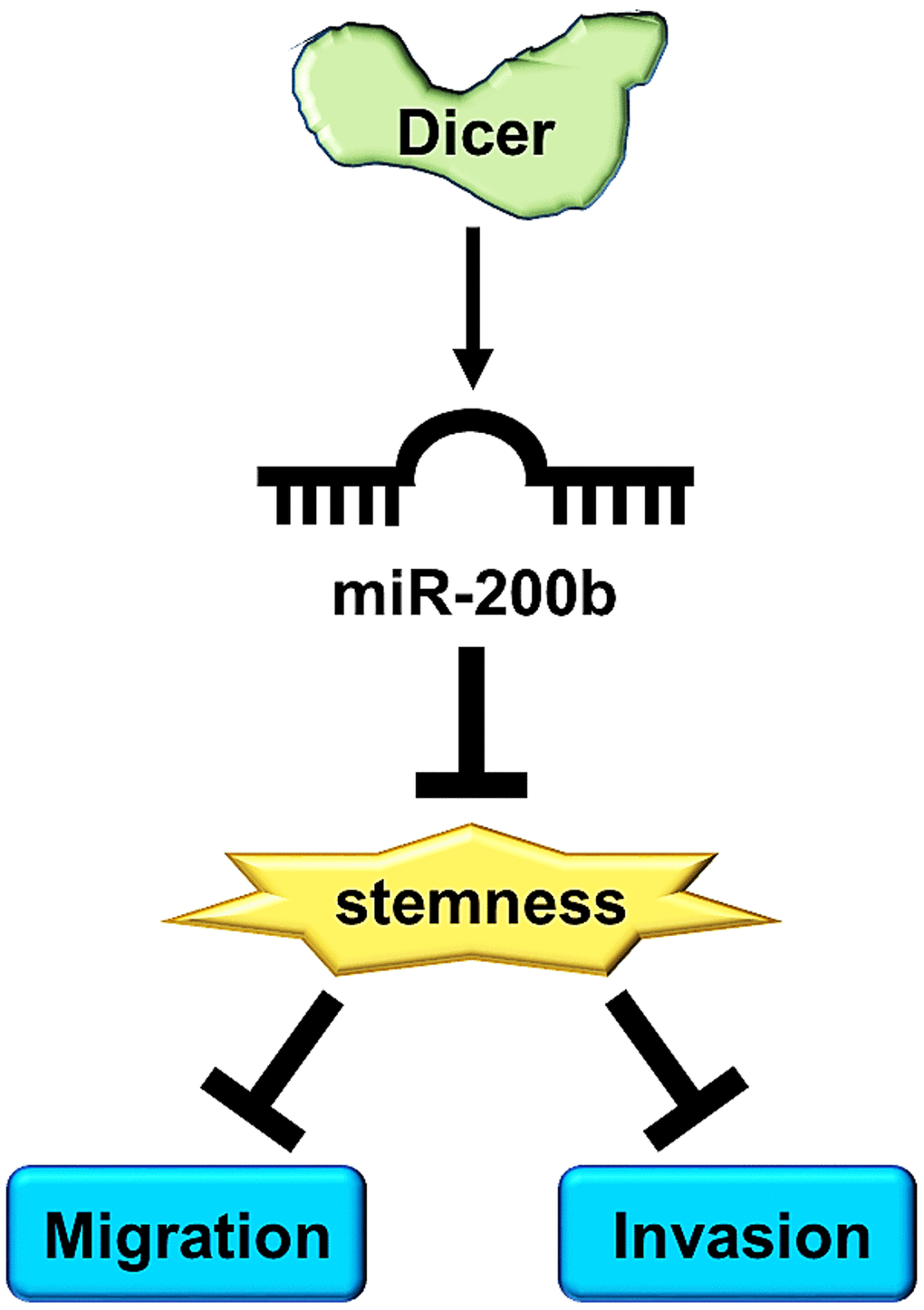 In this study, we elucidated the mechanisms through which Dicer enhances the cell migration and invasion of breast cancer cells. We determined that the protein expression level of Dicer significantly decreased in highly invasive breast cancer cells (MCF-7/I-3 and MDA-MB-231/I-3). Moreover, the results of The Cancer Genome Atlas (TCGA) database analysis showed that Dicer expression was inversely associated with the breast cancer stage compared with normal breast, and a lower Dicer expression level was correlated with poor overall survival in patients with breast cancer. Knockdown of Dicer expression increased the cell migration, invasion and CSCs properties of breast cancer cells, whereas the overexpression of Dicer reduced the cell migration, invasion and CSCs properties in breast cancer cells. More importantly, we further indicated that miR200b abolished the increase in the migration, invasion, and stemness of cancer cells caused by the knockdown of Dicer expression. Our findings imply that Dicer suppression contributes to the enhanced migration, invasion, and CSCs properties of breast cancer cells.