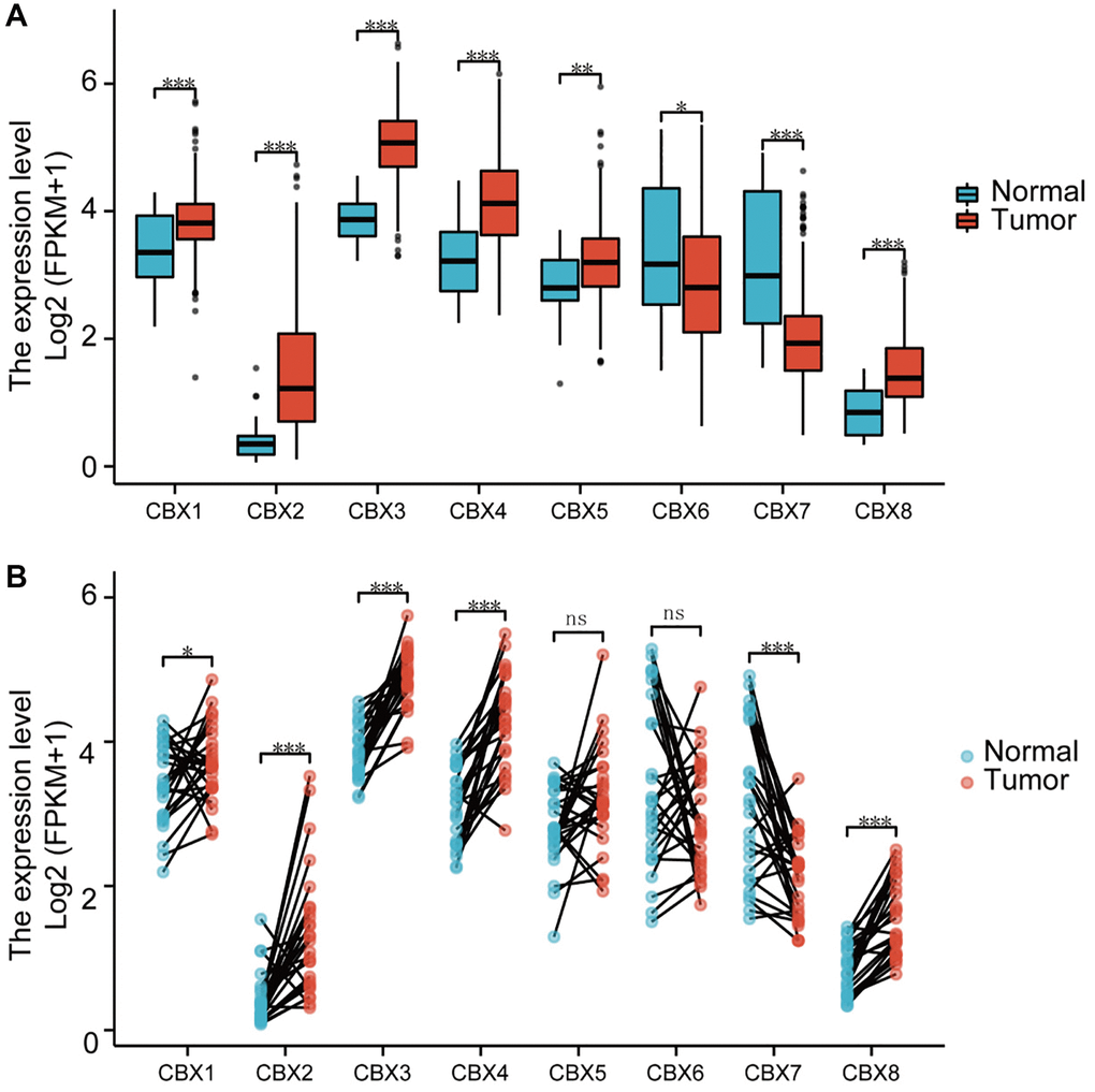 RNA-seq data were downloaded from the TCGA, including 32 normal tissues and 375 gastric cancer tissues to verify the mRNA expression patterns of 8 CBXs in gastric cancer. Expression levels of CBX1/2/3/4/8 in gastric cancer samples were significantly upregulated, whereas mRNA expressions of CBX7 were significantly downregulated compared to the normal control in unpaired and paired analysis (Figure 1). The mRNA expression levels of 408 gastric cancer tissues were compared with 211 normal tissues using GEPIA online database. As shown in Supplementary Figure 2, the mRNA levels of CBX1/2/3/5/8 in gastric cancer tissues were significantly upregulated. CBX7 expression was significantly down-regulated in tumor samples, consistent with outcomes in other gastric cancer types (Supplementary Table 1).
