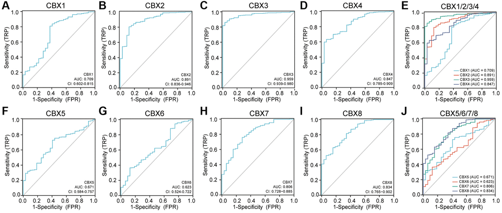 Figure 10 shows the receiver operating characteristic (ROC) curves for each CBXs gene. The area under the curve (AUC) for CBX3 was the highest at 0.959, indicating that CBX3-based prognostic indicators exert the best effect on patient stratification. Additionally, the AUC for CBX2/4/7/8 was more than 0.8, indicating the predictive efficacy of these genes.