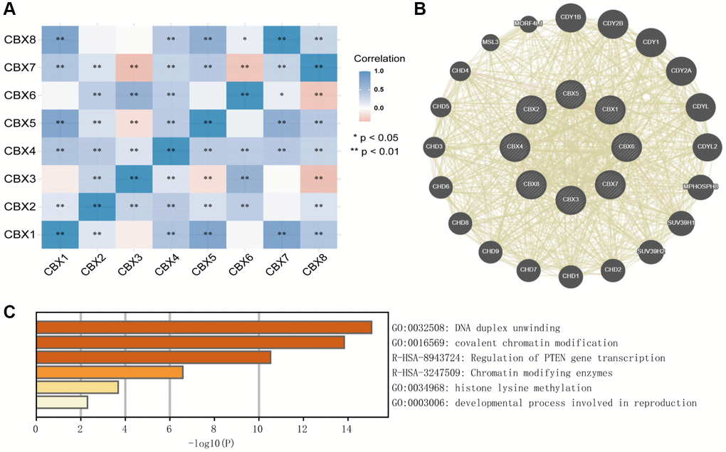 A moderate to high correlation was observed in CBX2, CBX3, CBX4, CBX6, and CBX7, and a high correlation among CBX1, CBX5, and CBX8 (Figure 11A). Co-expression neighbor gene analysis of differentially expressed CBXs was performed using the GeneMANIA to explore potential interactions among them (Figure 11B). Metascape was used to analyze the functions of CBXs and their neighboring genes. As a result, GO term and pathways, including DNA duplex unwinding, covalent chromatin modification, regulation of PTEN gene transcription, chromatin-modifying enzymes, histone lysine methylation, and developmental processes involved in reproduction were linked to CBXs functions in gastric cancer (Figure 11C).