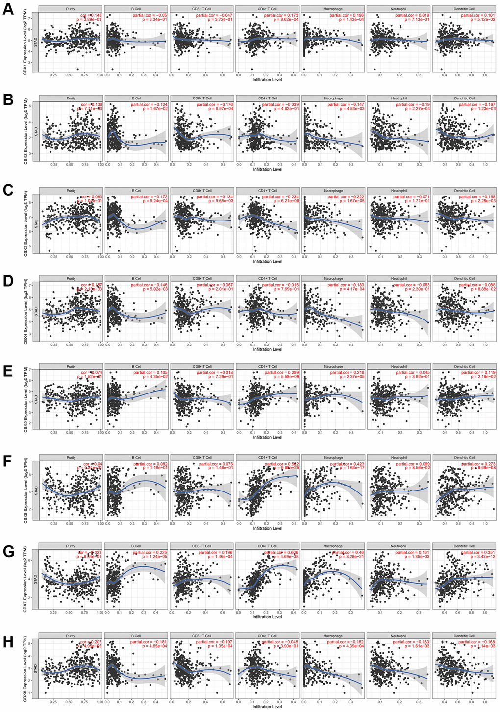 A positive correlation was noted between CBX1 expression and CD4+ T cells as well as macrophage infiltration (Figure 2A). CBX2 and CBX8 expression levels inhibited CD8+ T cells, macrophages, neutrophils, and dendritic cells infiltration (Figure 2B, 2H). A negative correlation was noted between CBX3 expression and B cells, CD8+ T cells, CD4+ T cells, macrophages, neutrophils, and dendritic cell infiltration (Figure 2C). CBX4 expression levels promoted B cell infiltration but suppressed macrophage infiltration (Figure 2D). Moreover, CBX5 expression promoted CD4+ T cells and macrophage infiltration (Figure 2E). A negative correlation was noted between CBX6 expression and CD4+ T cells, macrophages, and dendritic cell infiltration (Figure 2F). CBX7 expression promoted all types of immune cell infiltration (Figure 2G).