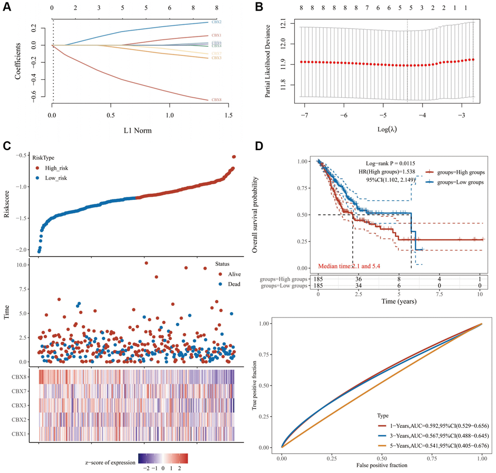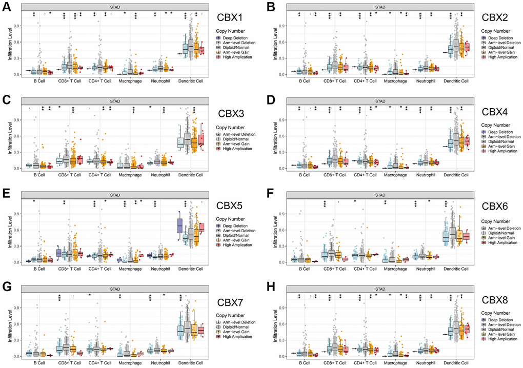 The relationship between CNVs of CBXs and immune cell infiltration was evaluated. The CNVs of CBXs significantly correlated with immune cells, including B cells, CD8+ T cells, CD4+ T cells, macrophages, neutrophils, and dendritic cell infiltrations (Figure 3).