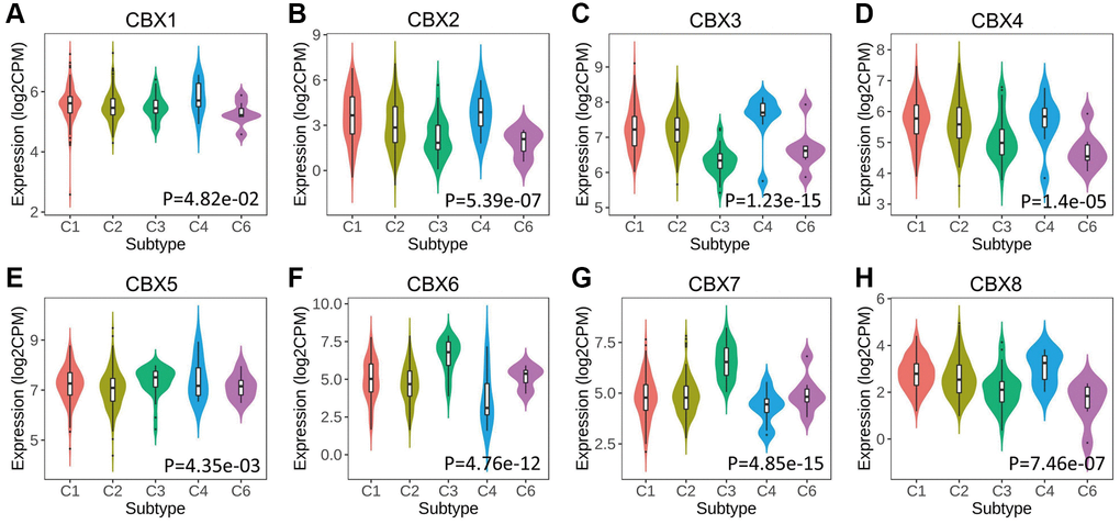 CBXs significantly correlated with five immune subtypes analyzed in the TISIDB database (Figure 4). Expression levels of CBX1/2/3/4/8 in lymphocyte depleted subtype (C4) were significantly greater than those in other subtypes, and CBX6/7 had a significantly lower expression level in C4 and a higher expression level in inflammatory subtype (C3).