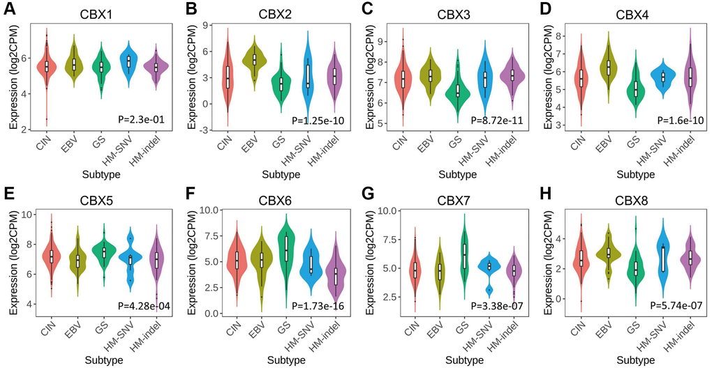 The relationships between CBXs and the five molecular subtypes were investigated in the TISIDB database. Expression levels of CBXs except for CBX1 significantly correlated with five molecular subtypes. Expression levels of CBX2/3/4/8 in the genomically stable (GS) subtype were significantly low compared to the other subtypes, and CBX5/6/7 exhibited a higher expression level in the GS subtype (Figure 5).