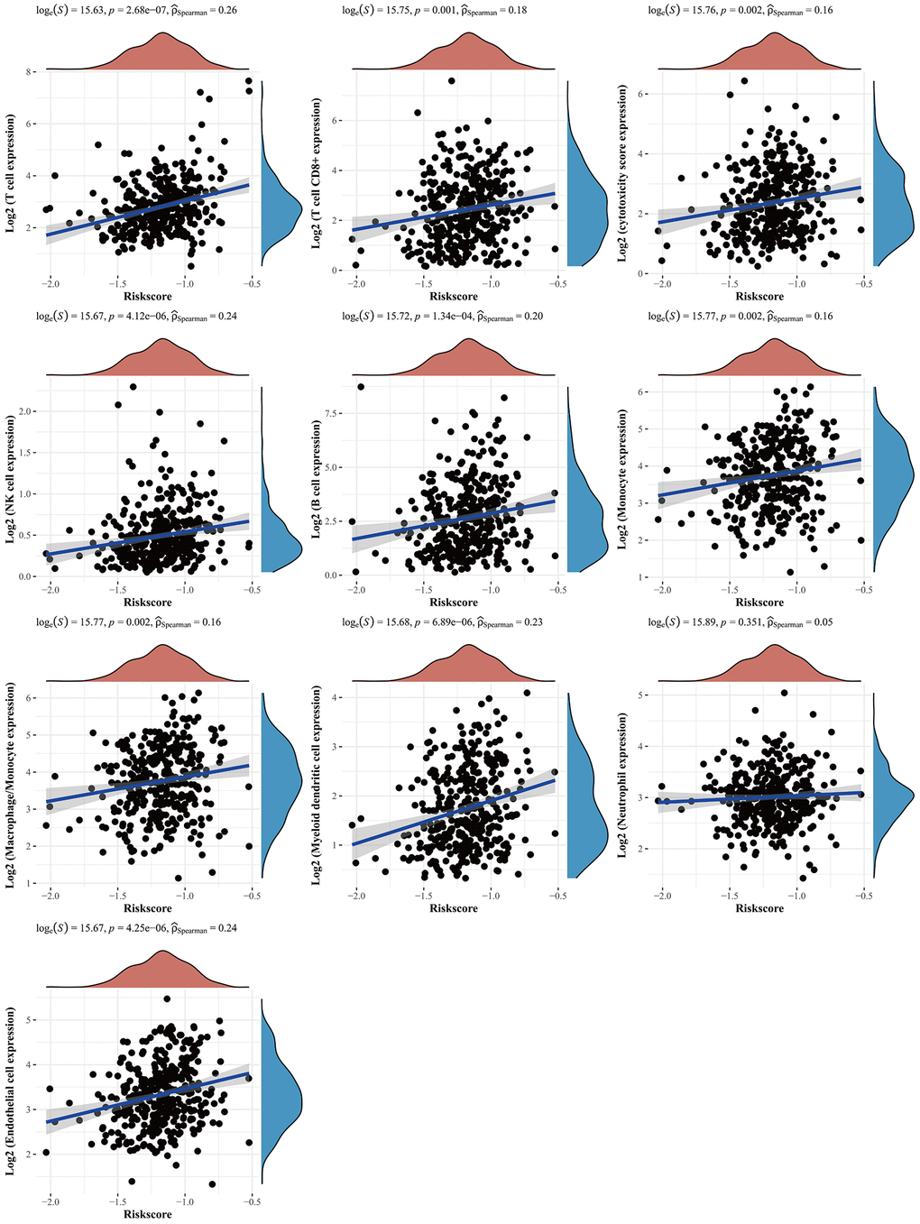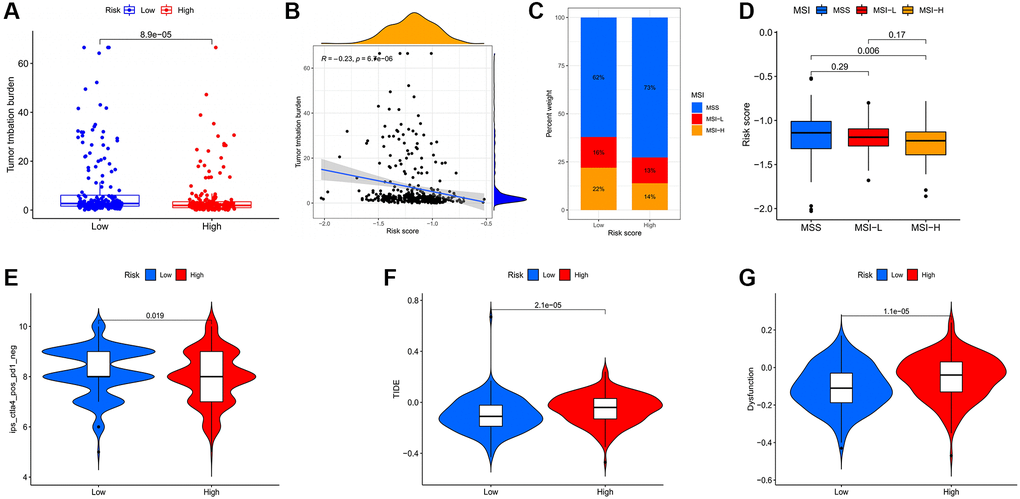 The correlation of model risk scores with immune checkpoints and TMB was analyzed in the TCGA-STAD and GSE84437 datasets by the ggpubr package. The TIDE and T cell dysfunction scores of TCGA-STAD tumor samples were predicted from the TIDE database (http://tide.dfci.harvard.edu/login/) and the levels of these scores were compared between high and low risk groups. TCGA-STAD IPS and MIS scores data were downloaded from the TCIA database (https://tcia.at/home) to compare the levels of these scores for high and low risk groups.