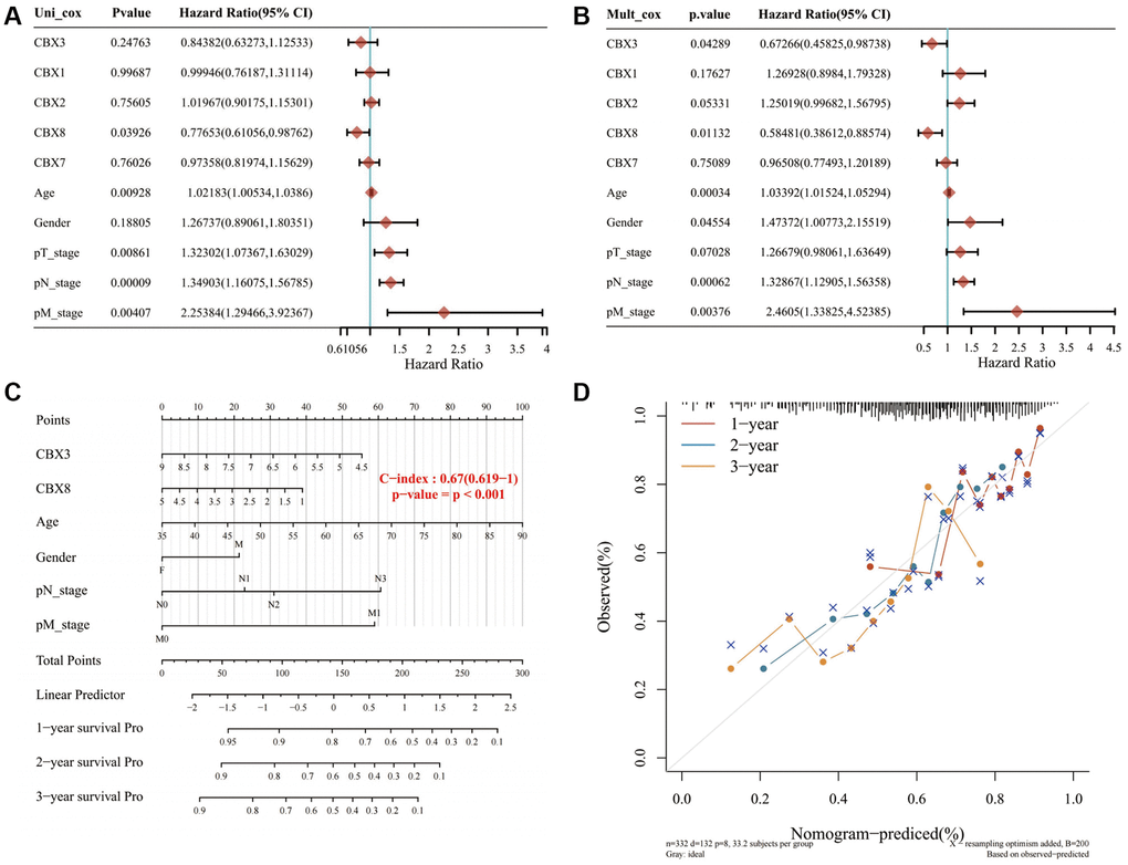 Univariate and multivariate regression analyses revealed that CBX3, CBX8, age, gender, pT stage, pN stage, and pM stage were independent factors for the prognosis of gastric cancer patients (Figure 9A, 9B). The predictive nomogram revealed that overall survival rates over 1, 2, and 3 years could be reasonably predicted (Figure 9C, 9D).