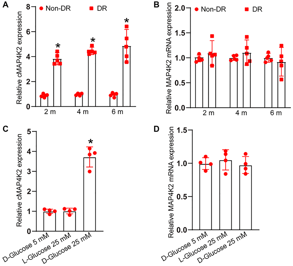 To investigate the expression kinetics of cMAP4K2 during the progression of DR, STZ was administered to C57BL/6 mice to build the murine model of type 1 diabetes mellitus. Retinal vessels were extracted from non-diabetic retinas and diabetic retinas at 2-month, 4-month, and 6-month induction of diabetes. qRT-PCR assays indicated the expression of cMAP4K2 but not MAP4K2 mRNA was obviously induced in diabetic retinal vessels (Figure 1A and 1B). Given increased cMAP4K2 expression in diabetic retinal vessels, we next investigated whether hyperglycemia could trigger the induction of cMAP4K2 in retinal endothelial cells. HRVECs were exposed to normal culture media containing 5 mM glucose, D-glucose (25 mM), or L-glucose (25 mM). qRT-PCR assays indicated the expression of cMAP4K2 but not MAP4K2 mRNA was significantly induced in the hyperglycemia group (25 mM of D-glucose) compared with the normoglycemia group (5 mM glucose) or L-glucose group (Figure 1C and 1D). Thus, these results provided the rational to explore the role of cMAP4K2 in retinal vascular dysfunction in DR.