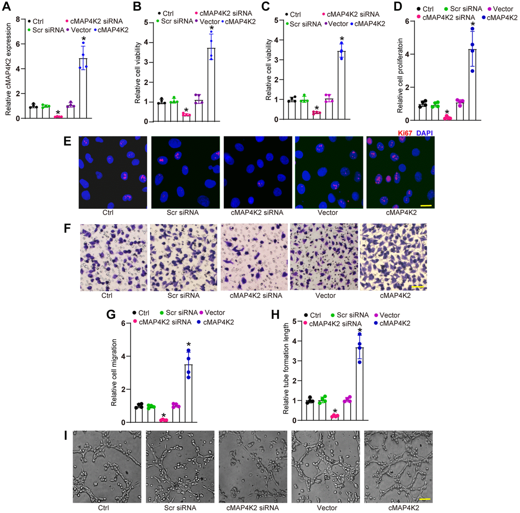 We then examined whether cMAP4K2 regulated endothelial angiogenic effects in vitro. Transfection of cMAP4K2 small interfering RNA (siRNA) led to reduced levels of cMAP4K2, while transfection of cMAP4K2 overexpression vector led to increased levels of cMAP4K2 in HRVECs (Figure 2A). MTT assays and CCK-8 assays revealed that transfection of cMAP4K2 siRNA decreased the viability of HRVECs (Figure 2B and 2C). Ki67 staining assays revealed that transfection of cMAP4K2 siRNA led to the reduction of HRVEC proliferation ability (Figure 2D and 2E). Transwell assays revealed that transfection of cMAP4K2 siRNA significantly decreased the migration ability of HRVECs (Figure 2F and 2G). Tube formation assays revealed that compared with control group, transfection of cMAP4K2 siRNA led to decreased cumulative tube length (Figure 2H and 2I). By contrast, cMAP4K2 overexpression led to the enhancement of cell viability, increased proliferative ability, accelerated migration ability, and enhanced tube formation ability (Figure 2B–2I). Thus, cMAP4K2 is shown as a critical regulator of endothelial angiogenic effects.