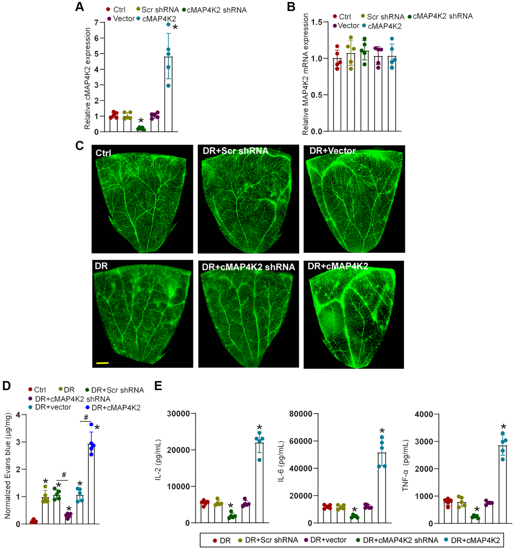 We next determined the role of cMAP4K2 in retinal vascular dysfunction in DR. Intraocular injection of cMAP4K2 shRNA led to reduced levels of cMAP4K2 but did not alter expression levels of MAP4K2 mRNA in the retina. By contrast, intraocular injection of cMAP4K2 overexpression virus led to increased expression of cMAP4K2 in the retina, but also had no effects on MAP4K2 mRNA expression (Figure 3A and 3B). Evans blue assays demonstrated that injection of cMAP4K2 shRNA could alleviate diabetes-induced retinal vascular leakage in DR (Figure 3C and 3D). ELISA assays showed that injection of cMAP4K2 shRNA could reduce retinal inflammation responses as shown by decreased levels of interleukin (IL)-2, IL-6, and tumor necrosis factor-α (TNF-α) in DR (Figure 3E). By contrast, injection of cMAP4K2 overexpression vector could lead to increased retinal vascular leakage and aggravated retinal inflammation in DR (Figure 3C–3E).