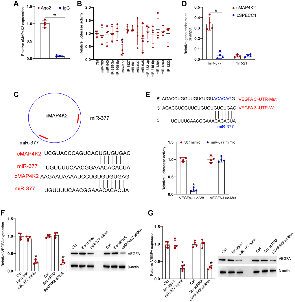 We next studied the underlying mechanism of cMAP4K2 in endothelial cells. Previous studies have shown that circRNAs usually modulate gene expression by acting as miRNA sponges [11, 20]. Ago2 protein can bind miRNA complex to their target mRNAs. RNA immunoprecipitation (RIP) assays demonstrated that Ago2 antibody could specifically pull down cMAP4K2. By contrast, IgG could not specifically pull down cMAP4K2 transcript (Figure 4A). TargetScan algorithm was employed to identify the potential miRNAs which could interact with cMAP4K2 transcript. Luciferase activity screening showed that transfection of miR-377 mimics but no other miRNA mimics led to reduced luciferase activity of LUC-cMAP4K2 (Figure 4B). The potential binding regions of miR-377 on cMAP4K2 transcript were shown in Figure 4C. RNA pull-down assays demonstrated that cMAP4K2 was highly enriched in the miR-377-captured fraction compared with miR-21-captured fraction (negative control) (Figure 4D). VEGFA was predicted as the target gene of miR-377. The 3′-UTR of VEGFA was fused to luciferase reporter gene to obtain LUC-VEGFA vector. Luciferase activity assays demonstrated that overexpression of miR-377 significantly decreased the luciferase activity of LUC-VEGFA, whereas the mutation of miR-377-binding site within VEGFA prevented miR-377 mimic-mediated reduction of luciferase activity of LUC-VEGFA (Figure 4E).