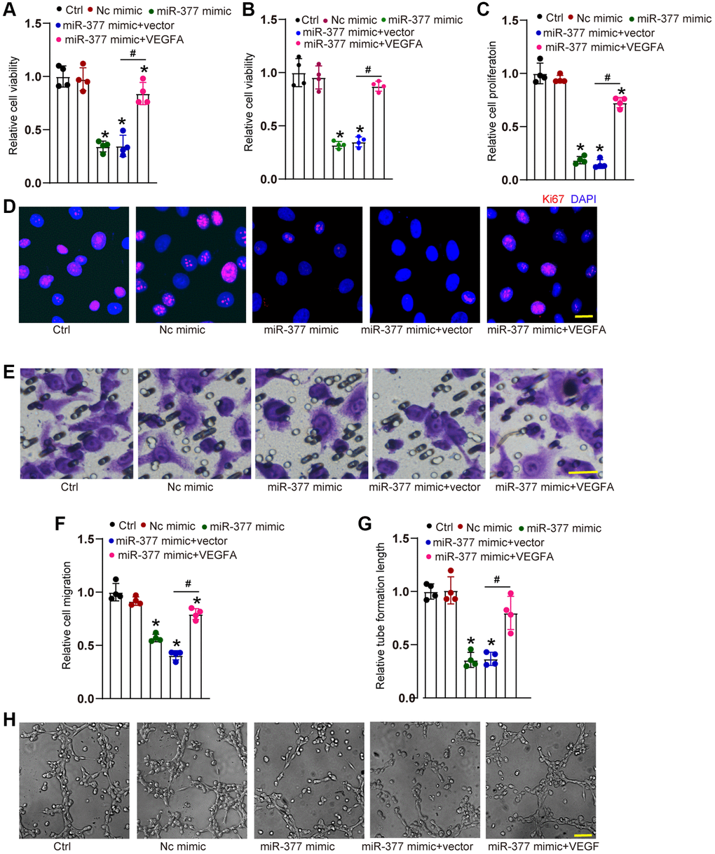 We also examined the role of miR-377 in endothelial angiogenic effects in vitro. Transfection of miR-377 mimic led to a marked reduction of cell viability (Figure 5A and 5B) as shown by MTT assays and CCK-8 assays, decreased proliferative ability (Figure 5C and 5D), reduced migration ability (Figure 5E and 5F), and reduced tube formation ability (Figure 5G and 5H). By contrast, overexpression of VEGFA could partially reverse the anti-angiogenic effects of miR-377 mimic on HRVEC as shown by increased cell viability, increased proliferative ability, accelerated cell migration, and enhanced tube formation ability (Figure 5A–5H). These results suggest that cMAP4K2-miR-377-VEGFA signaling axis regulates endothelial angiogenic function in vitro.