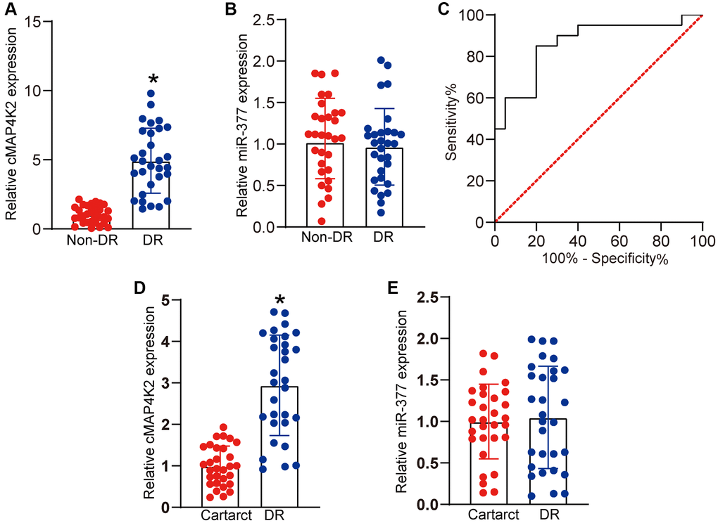 We thus studied the clinical significance of cMAP4K2-mediated signaling dysfunction in DR. Vitreous sample is the body fluid in ocular tissue, which can reflect the progression of ocular diseases [4]. qRT-PCR assays revealed that vitreous levels of cMAP4K2 were markedly up-regulated in DR patients (Figure 6A). By contrast, vitreous levels of miR-377 were not altered in DR patients (Figure 6B). We then determined the discriminative power of cMAP4K2 between non-DR controls and DR patients, the area under the ROC-AUC was calculate. The ROC-AUC of cMAP4K2 for differentiating DR patients from non-DR controls was 0.8625 (Figure 6C; 95% CI: 0.7452–0.9798). Aqueous humor (AH) was collected from the patients with DR or the patients with cataract before surgery. qRT-PCR assays revealed that AH levels of cMAP4K2 but not miR-377 were significantly up-regulated in DR patients (Figure 6D and 6E). Collectively, these results indicate that cMAP4K2 is a promising marker for the diagnosis of DR.