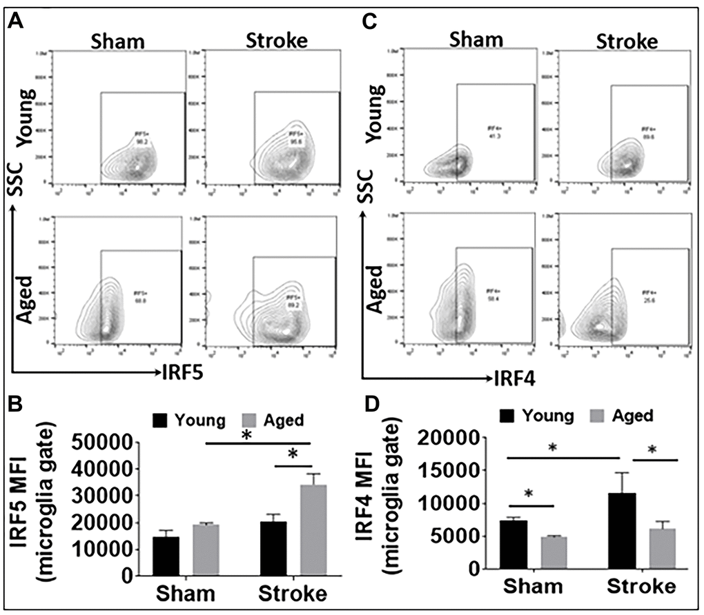 Numerous neurochemical and neurobiological changes occur with aging [1–3]. As a fundamental pathophysiological process in stroke, neuroinflammation also showed age-related differences [4–8]. Microglial activation plays a central role in initiating and perpetuating the post-stroke inflammation, and acts as a “double-edged” sword to confer both detrimental and beneficial effects [9]. Our previous studies using young animal stroke model have found a determinant role of IRF4-IRF5 regulatory axis in mediating microglial responses after stroke; however, whether aged microglia also undergo the same regulatory mechanism after ischemia has been elusive. Aged microglia are primed to activation even without any exogenous pathological stimulus [10]; once activated, they showed aberrant phagocytosis compared to the young microglia. Stroke is a disease that mainly affects the elderly. Therefore, it is of high translational value to study how aged microglia is regulated in stroke.