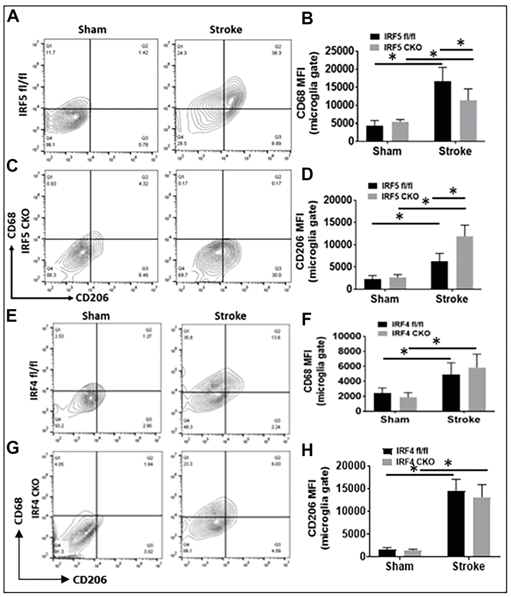 Aging impacts on the immunological response to ischemic stroke [8]. To investigate whether IRF5 and IRF4 signaling induce similar inflammatory responses to stroke in aged microglia as that in the young [11, 12], we examined both surface and intracellular inflammatory markers in microglia from IRF5 or IRF4 CKO aged mice at 3d of MCAO. The CKO mice were generated by crossing IRF5 or IRF4 floxed mice with lysozyme M (LysM) Cre mice that have been widely used to target genes of interest in microglia [11, 13, 14]. CD68 and CD206 are well-established pro- and anti-inflammatory markers respectively expressed on microglial cell membrane [15–17]. Our results showed that MFI of CD68 was significantly downregulated in IRF5 CKO vs. flox mice after stroke; meanwhile CD206 was significantly upregulated by IRF5 CKO (Figure 2A–2D). CKO of IRF4 in aged microglia had no effect on CD68 or CD206 expression (Figure 2E–2H). Stroke caused significant increase in the two markers in all groups compared to shams.