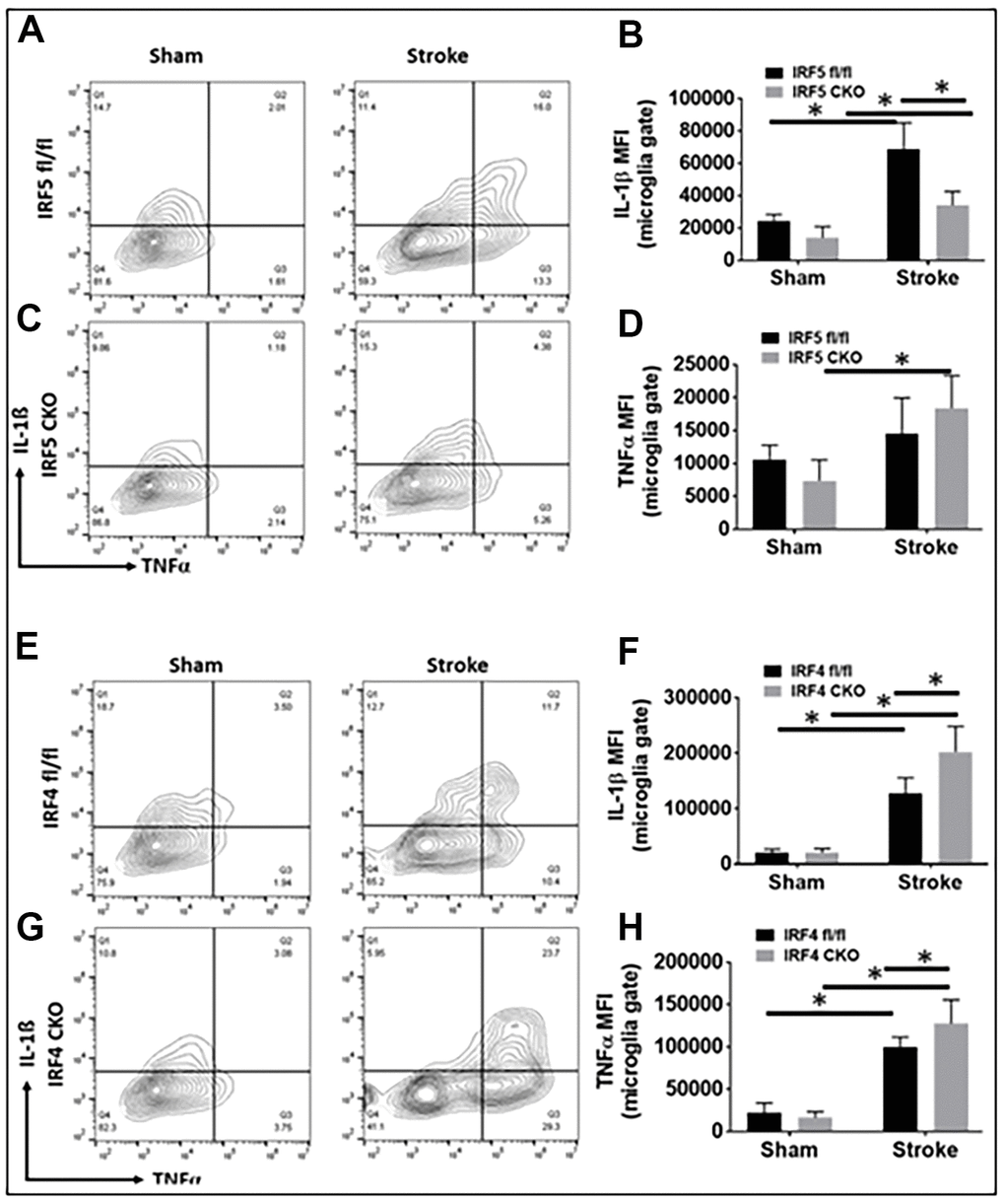 For intracellular inflammatory markers we investigated IL-1β/TNF-α (pro-inflammatory) and IL-4/IL-10 (anti-inflammatory) [11]. While IRF5 CKO led to a decrease only in IL-1β expression after stroke, IRF4 CKO caused up-regulation of both IL-1β and TNF-α in ischemic microglia (Figure 3A–3H). Neither IRF5 nor IRF4 CKO had any effect on microglial IL-4 or IL-10 expression (Supplementary Figure 2A–2H). There were stroke effects on almost all these markers.