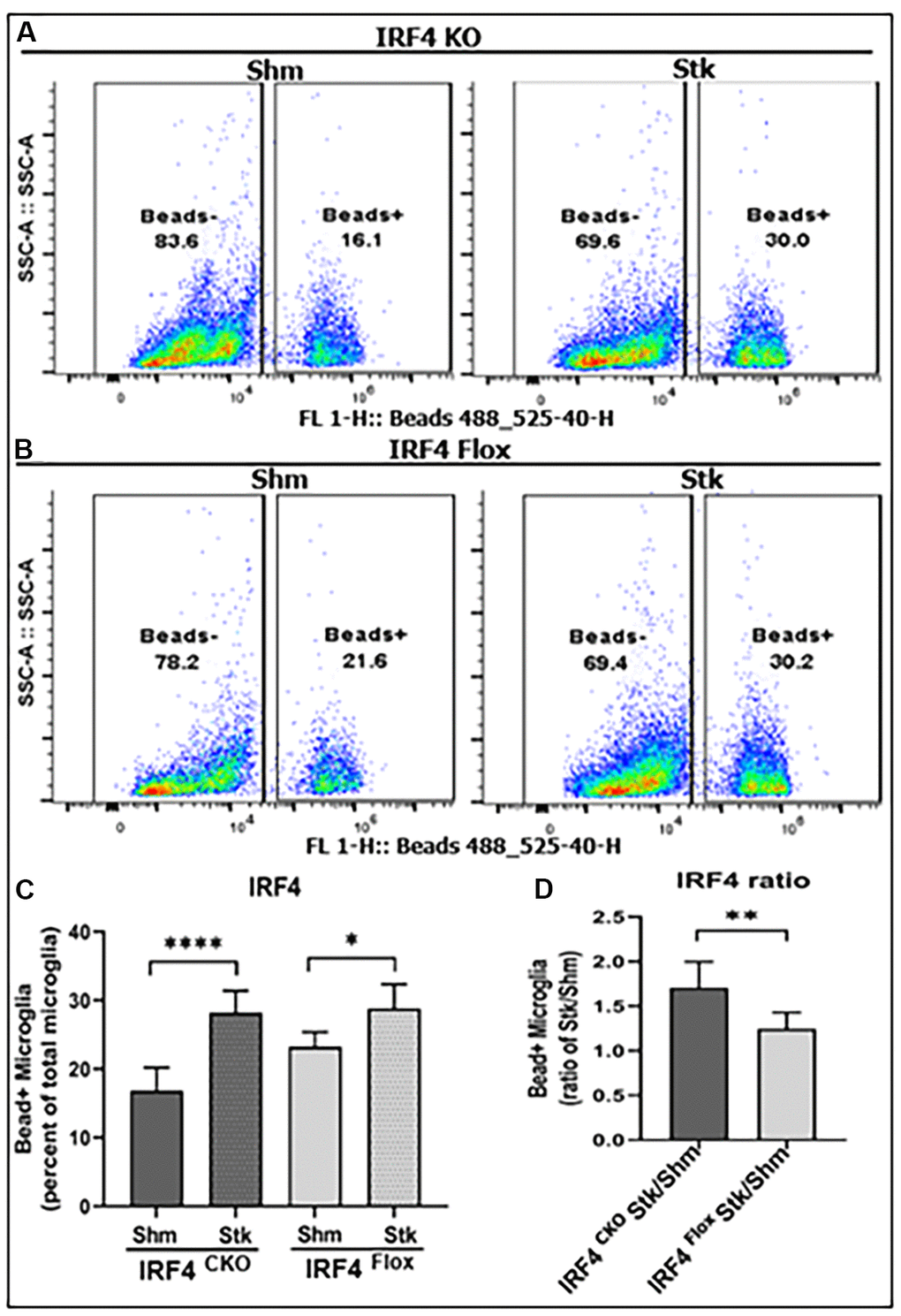 Phagocytosis is a highly specialized process for the uptake and removal of opsonized and non-opsonized targets including pathogens, apoptotic cells, and cellular debris in all phagocytes including microglia [18, 19]. We already knew IRF5 and IRF4 signaling impact on microglial expression of cell membrane (Figure 2) and intracellular inflammatory markers (Figure 3). Next, we sought to investigate whether IRF5 or IRF4 also affect another important microglial function, i.e. phagocytosis, which was measured by the cell’s ability to phagocytose FITC bioparticles with flow cytometry in these aged mice. Figure 4A, 4B show the flow gating strategy for microglia that phagocytosed FITC bioparticles (Beads+) [5, 20]. After stroke, the ischemic microglia had increased phagocytosis in either IRF4 CKO or flox group (Figure 4C); however, the increase was significantly more robust in IRF4 CKO vs. flox mice as indicated by the ratios of stroke over sham group (Figure 4D). IRF5 signaling does not have any effect on the microglial phagocytosis (Supplementary Figure 3).
