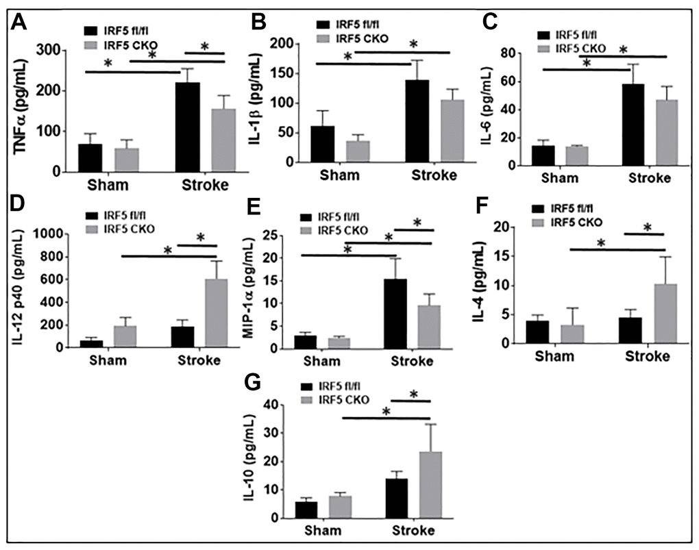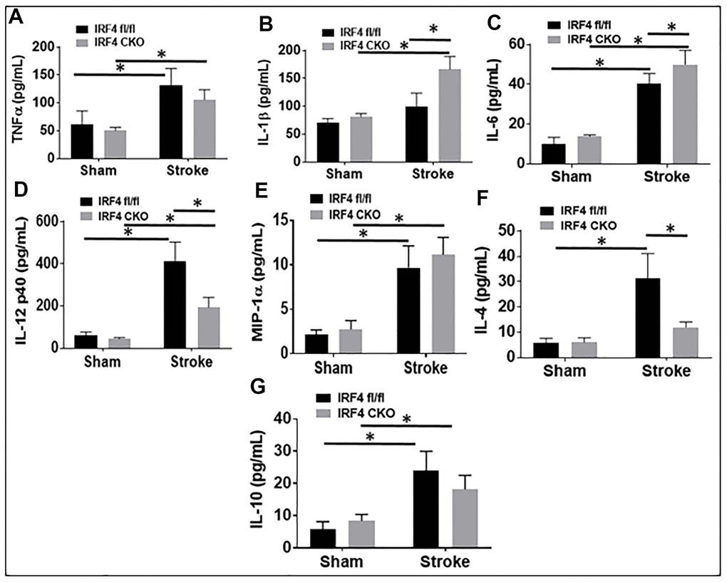 Blood plasma cytokine levels are reflective of systemic inflammatory responses to stroke [21–23], and circulating cytokines direct the migration and infiltration of peripheral immune cells into the ischemic brain [24–27]. Since microglial activation triggers and perpetuates immune responses to stroke [28–31] and IRF5/IRF4 signaling regulate microglial activation, we next wanted to know if microglial IRF5 or IRF4 signaling impacts on plasma cytokine levels. The pro-inflammatory (TNF-α, IL-1β, IL-6, IL-12 p40, and MIP-1α), and the anti-inflammatory (IL-4 and IL-10) mediators were examined by ELISA in IRF5 or IRF4 CKO aged mice plasma, 3 days after stroke. As expected, stroke effects were evident as levels of almost all the inflammatory mediators significantly increased after stroke in either IRF flox or CKO groups (Figures 5, 6). However, when we compared the levels of pro-inflammatory mediators between flox and CKO mice after stroke, we found the differences within groups exhibited a heterogeneous manner (Figures 5A–5E, 6A–6E). TNF-α/MIP-1α levels significantly decreased, but IL-12p40 significantly increased in IRF5 CKO vs. flox mice after stroke (Figure 5A, 5E, 5D). IL-1β/IL-6 increased but IL-12p40 decreased in IRF4 CKO vs. flox mice after stroke (Figure 6B, 6C, 6D). For anti-inflammatory cytokines, a relatively homogenous pattern was seen; IRF5 CKO induced a significant increase in both IL-4 and IL-10 levels (Figure 5F, 5G), and IRF4 CKO caused significant reduction in IL-4 (Figure 6F) and a decrease trend in IL-10 (Figure 6G) level, in stroke groups.