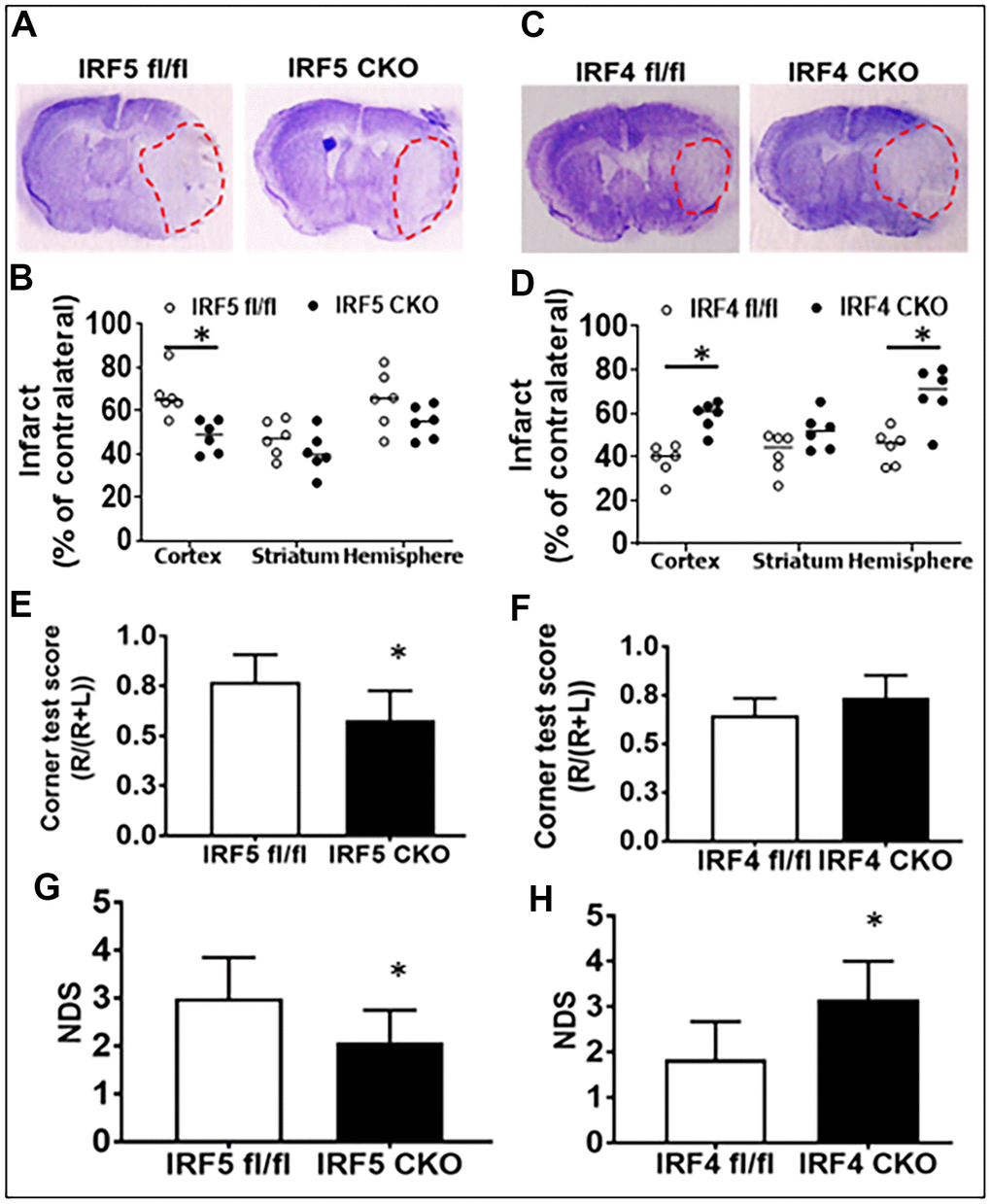 Lastly, we evaluated stroke outcomes in these IRF5 or IRF4 CKO aged mice. Three days after MCAO, the infarct volumes and a battery of behavior tests were examined. We found significantly smaller infarcts in brain cortical regions of aged IRF5 CKO vs. flox (Figure 7A, 7B) mice. In contrast, IRF4 CKO led to significantly larger infarct in the cortex and the whole ipsilateral hemisphere (Figure 7C, 7D). Positive results were seen in two behavior tests: corner test and NDS. IRF5 CKO mice had better outcomes in both tests (Figure 7E, 7G), and IRF4 CKO led to significantly higher NDS (Figure 7H) after MCAO. These data suggest that IRF5 is detrimental and IRF4 protective in aged stroke.