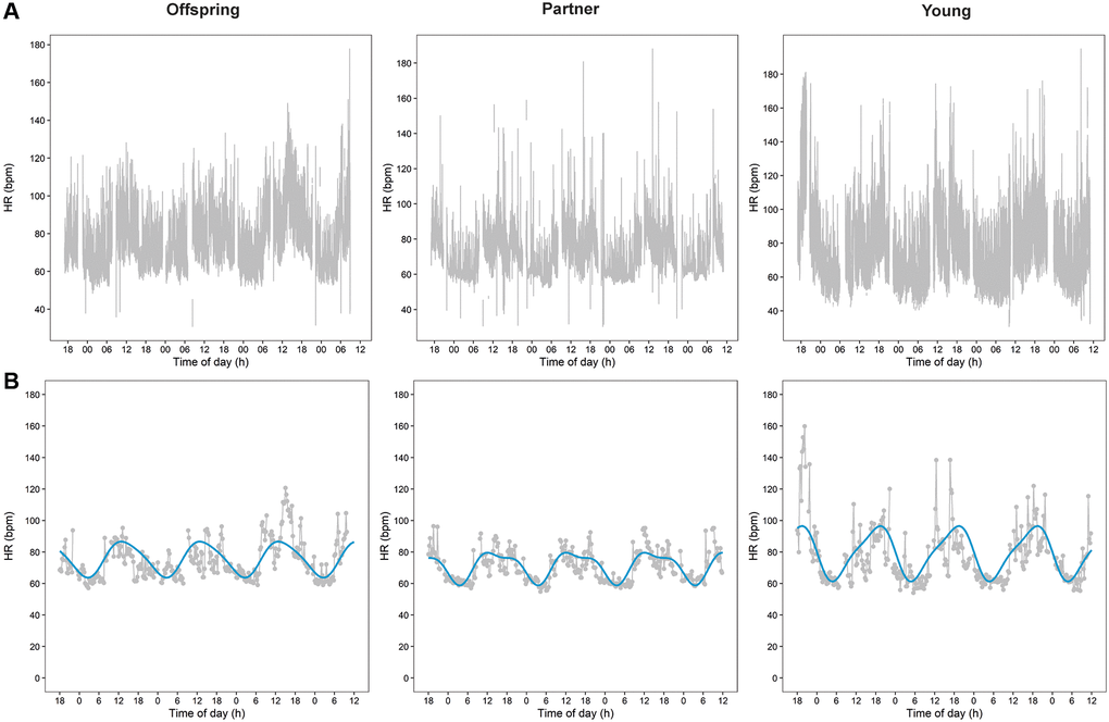 In Figure 1A, we present plots of raw HR data during 3.5 days of three representative participants: one middle-aged offspring of a long-lived family, one middle-aged partner, and one young individual.